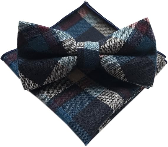 Elfeves Men's Cotton Bow Ties Pocket Square Set Pre-Tied Checks Handmade Necktie