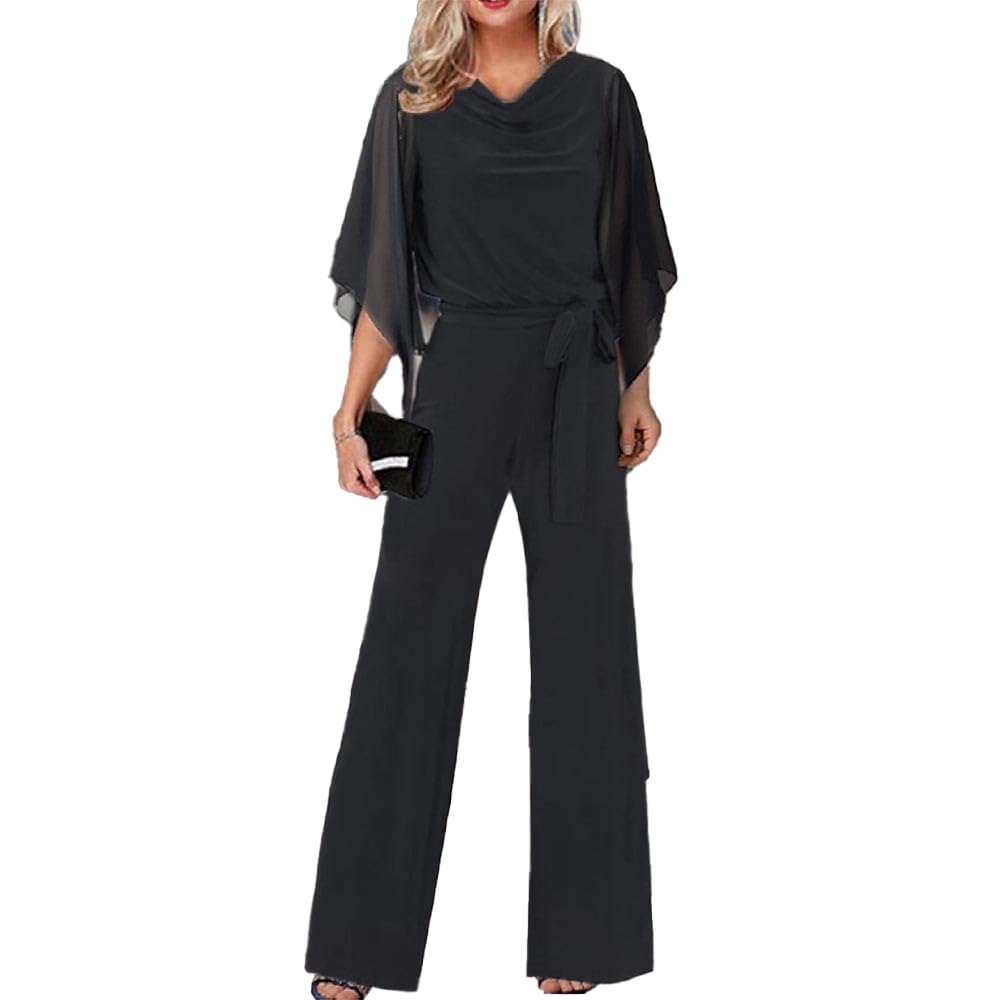 PORCLAY Womens Dressy Jumpsuit Chiffon Cocktail Pantsuits For Wedding Guest Irregular Dressy Pantsuits For Evening Party Black 3X-Large