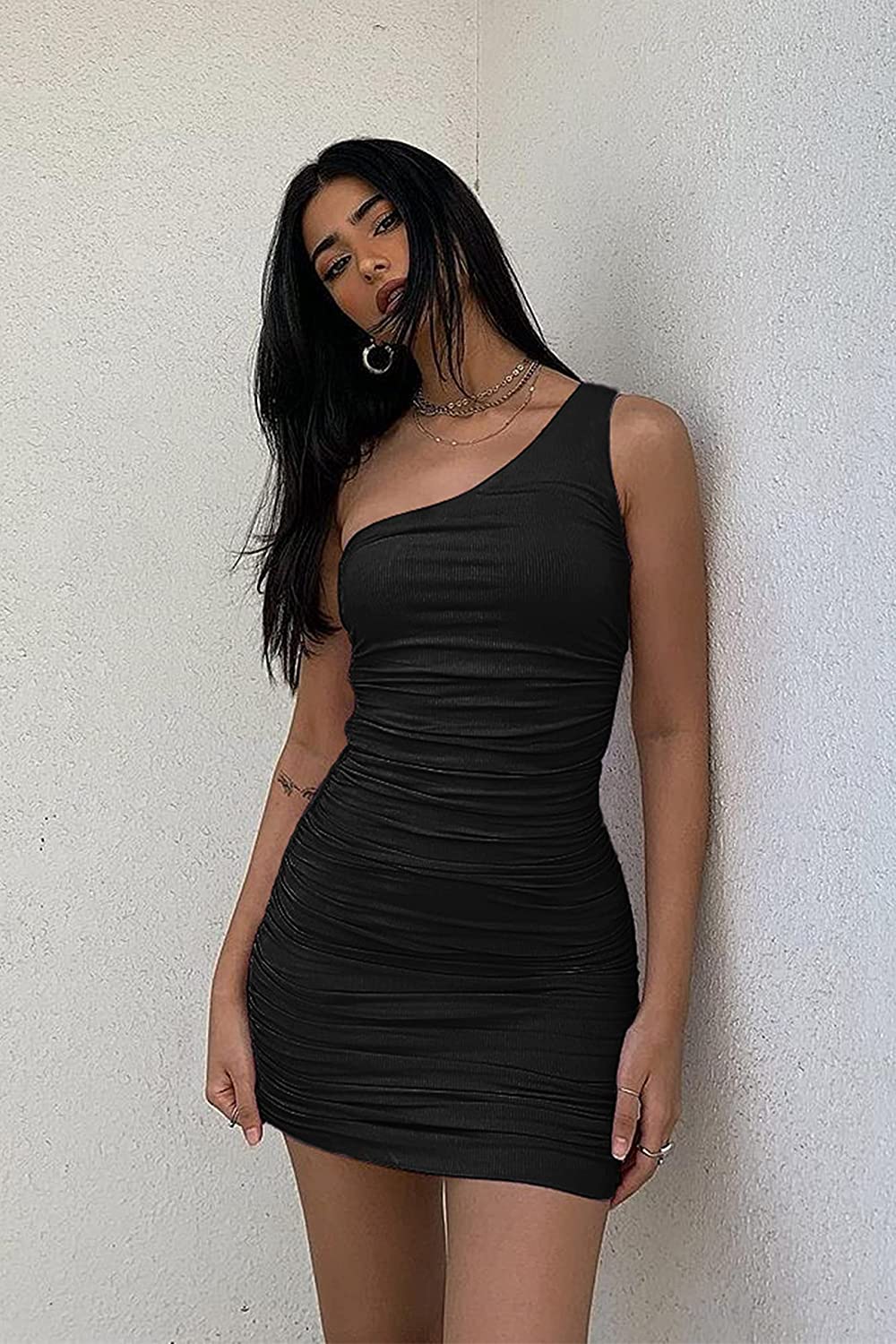 • A MUST-HAVE BODYCON DRESS ! This Mini Dress Is A One Shoulder Design, Greatly Reveals Yours Sleek Shoulder, Blooming Feminine Charm. The Ruched Bodycon Dress Is Tight-Fitness, Show Your Sexy Body Shape. This Fitted Short Dress With Ruched Style, Looks More Slim Fit From Visual. The Tight Summer Dress Is Solid Color, Simple And Generous Enough To Show Enchantment.