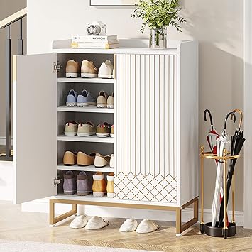Tribesigns White, 25 Pair Shoe Cabinets with Doors, 5-Tier Modern Shoe Rack Organizer Cabinet, Freestanding Wood Storage Cabinet with Gold Metal Frame for Bedroom Hallway Living Room