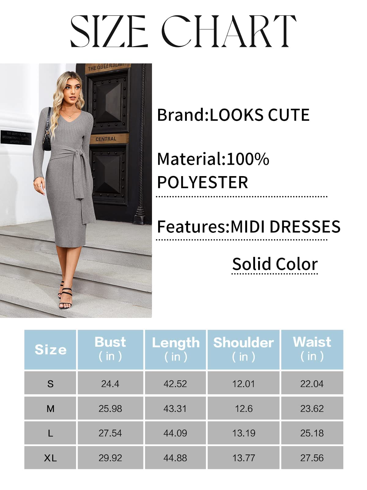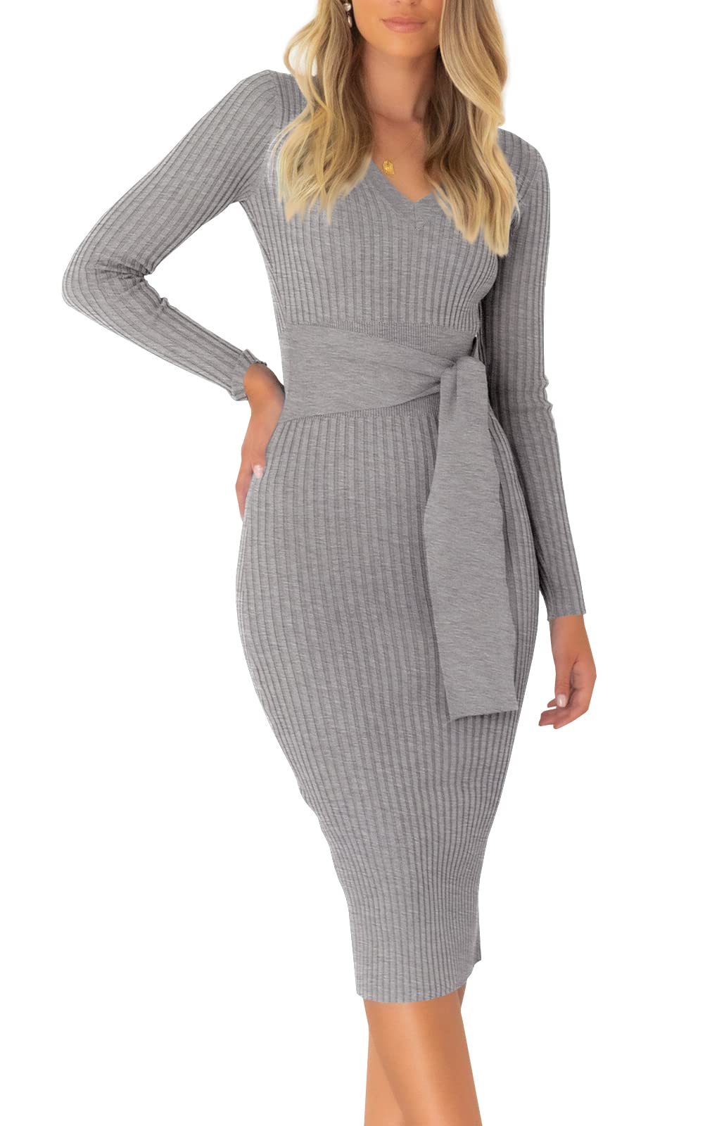 Looks Cute Womens Elegant V Neck Long Sleeve Dress Bodycon Ribbed Knit Tie Waist Midi Sweater Dresses Grey