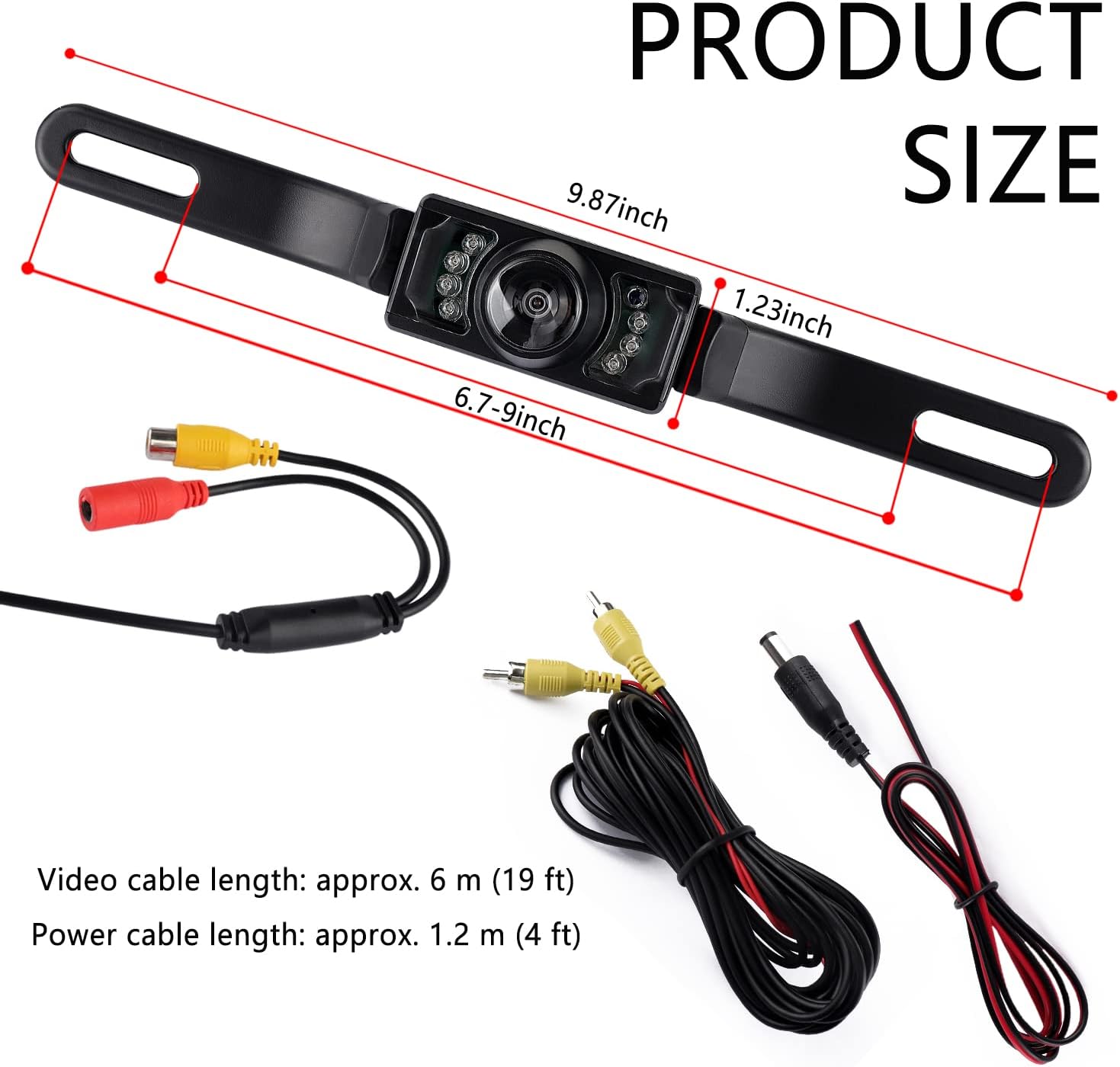 • 【Wide compatibility】: The license plate backup camera is suitable for hanging in the license plate area, rear window or any other suitable place of various 12-24V cars, trucks and RV's cars, Distance between left and right mounting holes: 6.7-9inch.Concealed and unobtrusive,equipped with 6M RCA video cable to connect to any type of monitor.