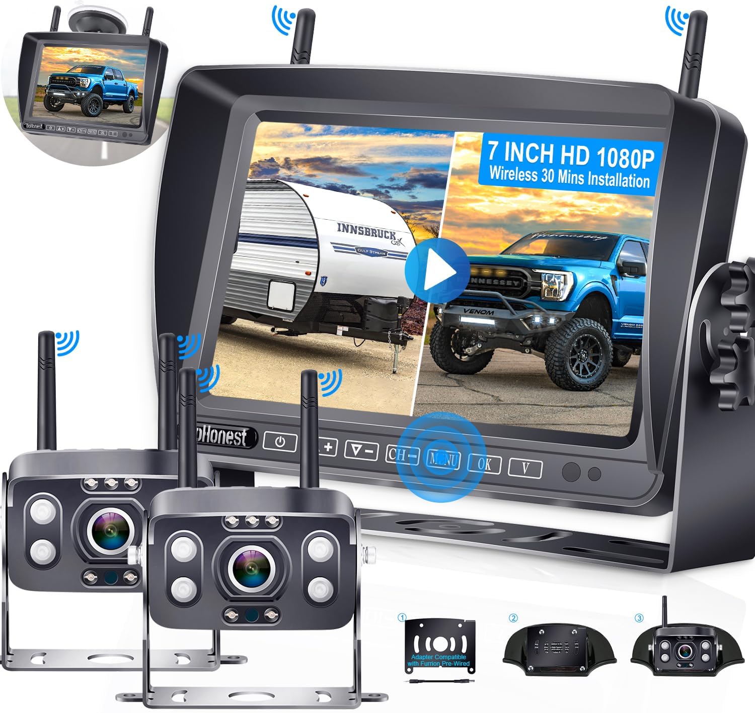 RV Trailer Wireless Backup Camera: 2 Cameras Plug and Play for Furrion Pre-Wired System Recording 7" Sensitive Touch Key Monitor HD 1080P Truck Camper Fifth Wheel Rear View Cam 4 Channels DoHonest V23
