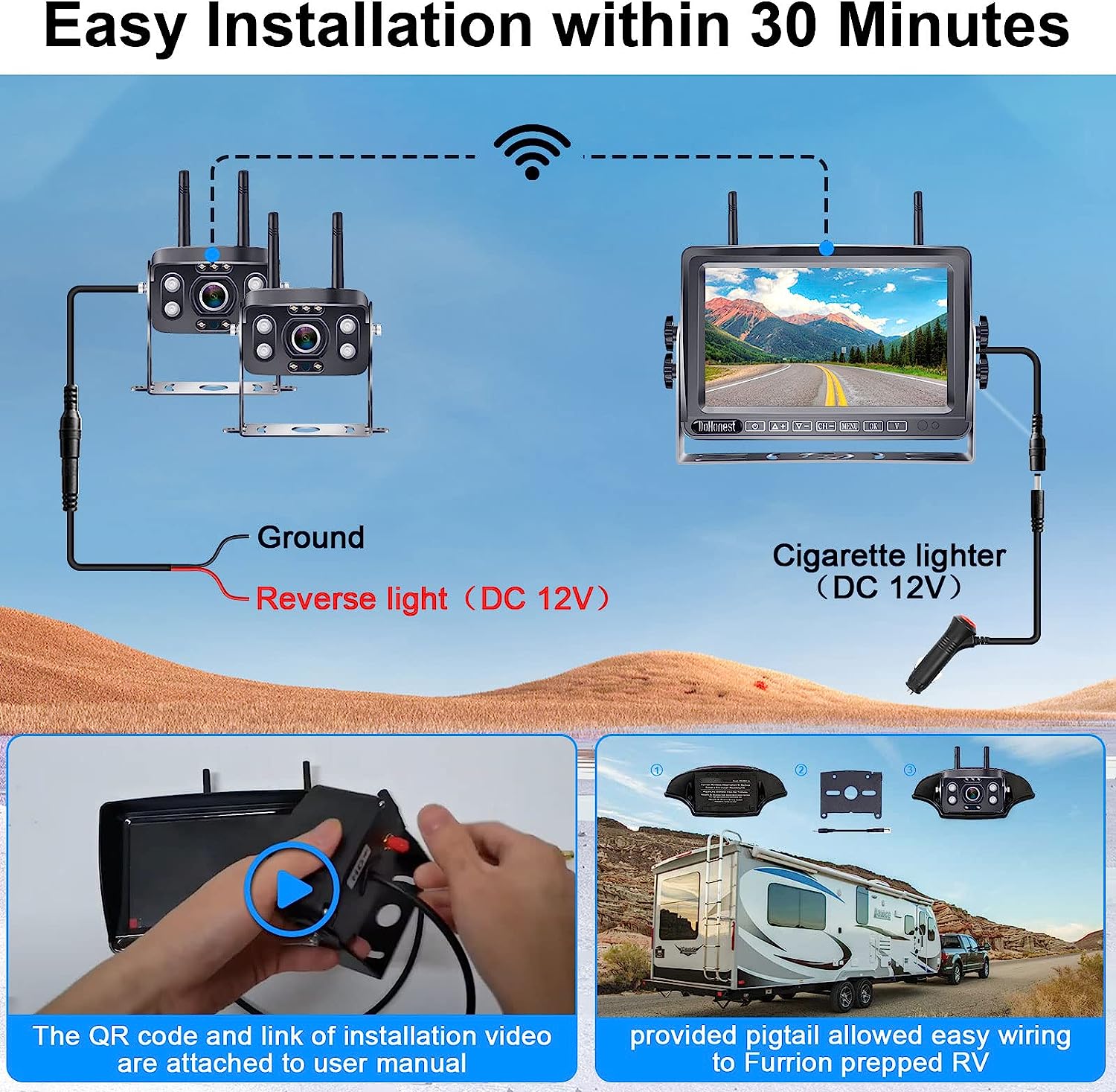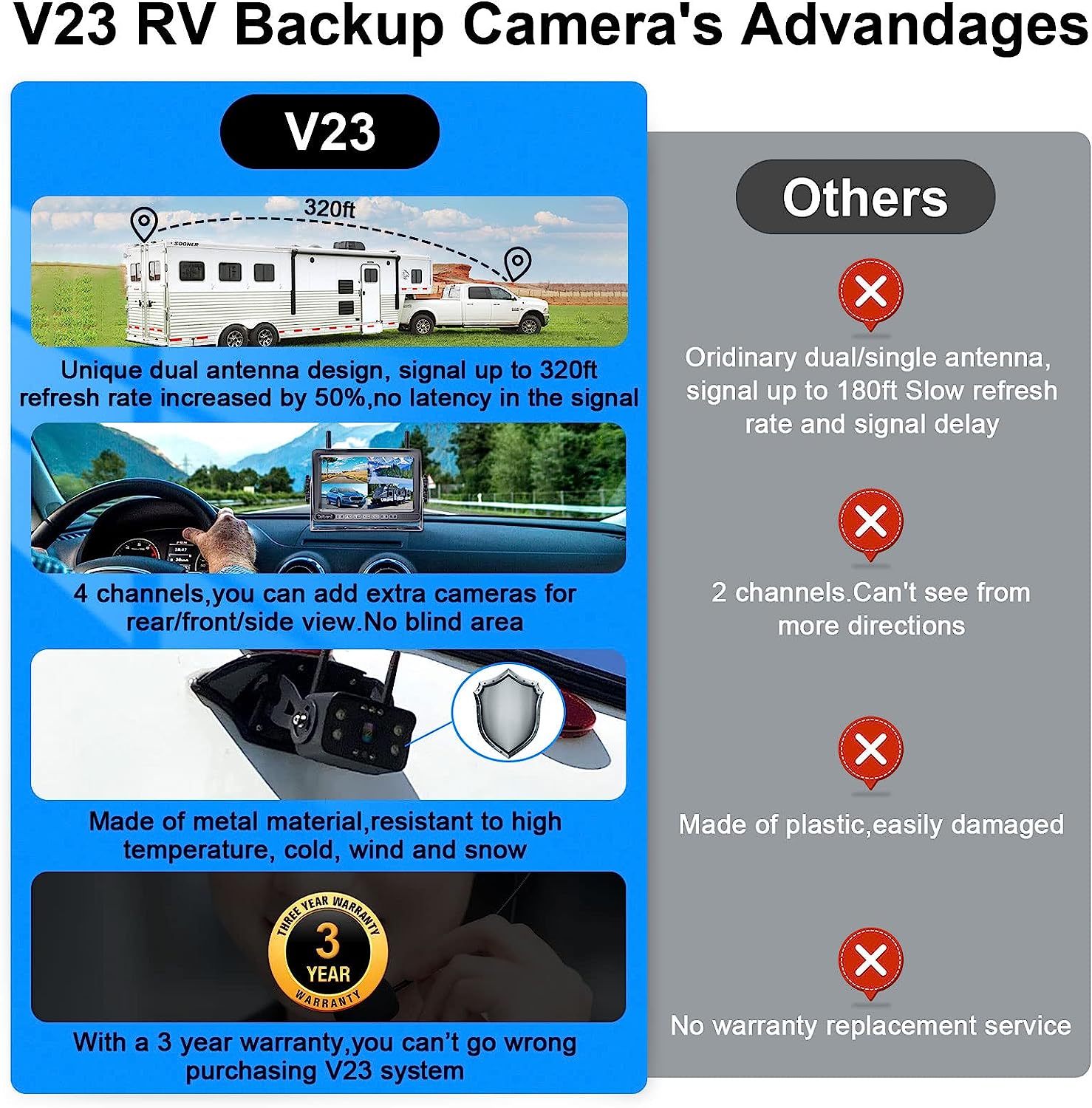 • ★Keep your safety a top priority with the V23 wireless backup camera for rv -it's like a "DVR dash monitor" for your rear and can act as a travel trailer wireless reverse camera that records surroundings as preventive measures.