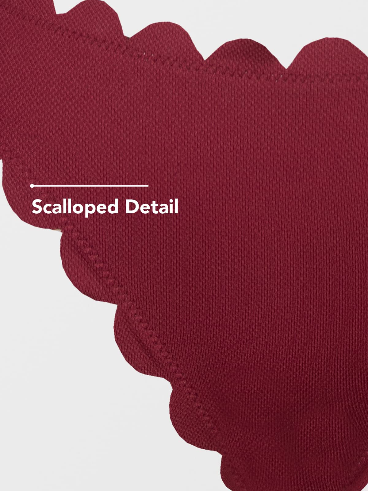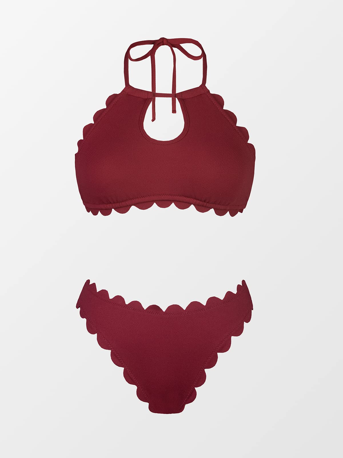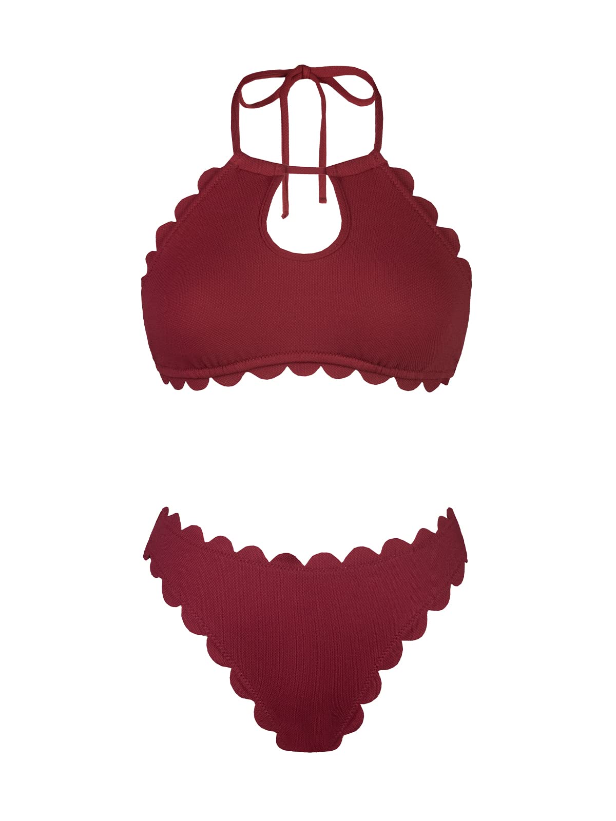 • Design: Make your mark at the beach in the bikini swimsuit. This high neck bikini with keyhole cutout shows off a hint of skin, while the scalloped edges lend a sweet look. The matching bottom has low rise with the same scalloped edges and standard bum coverage.