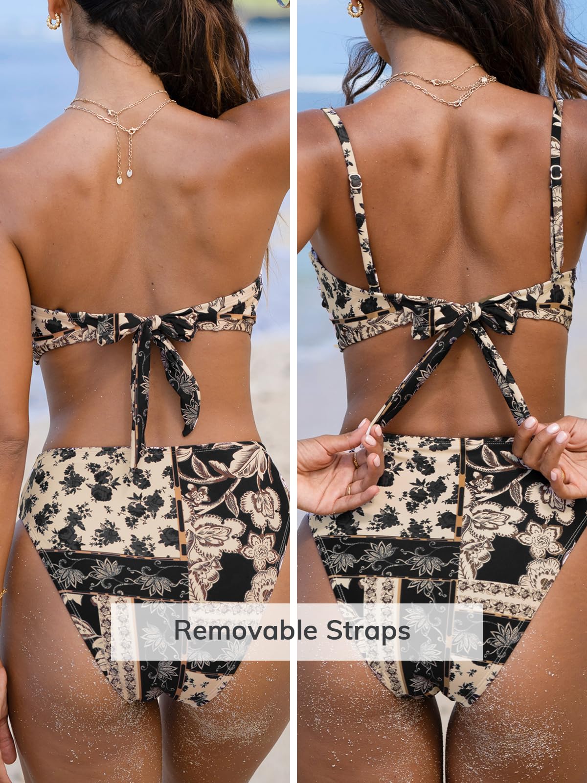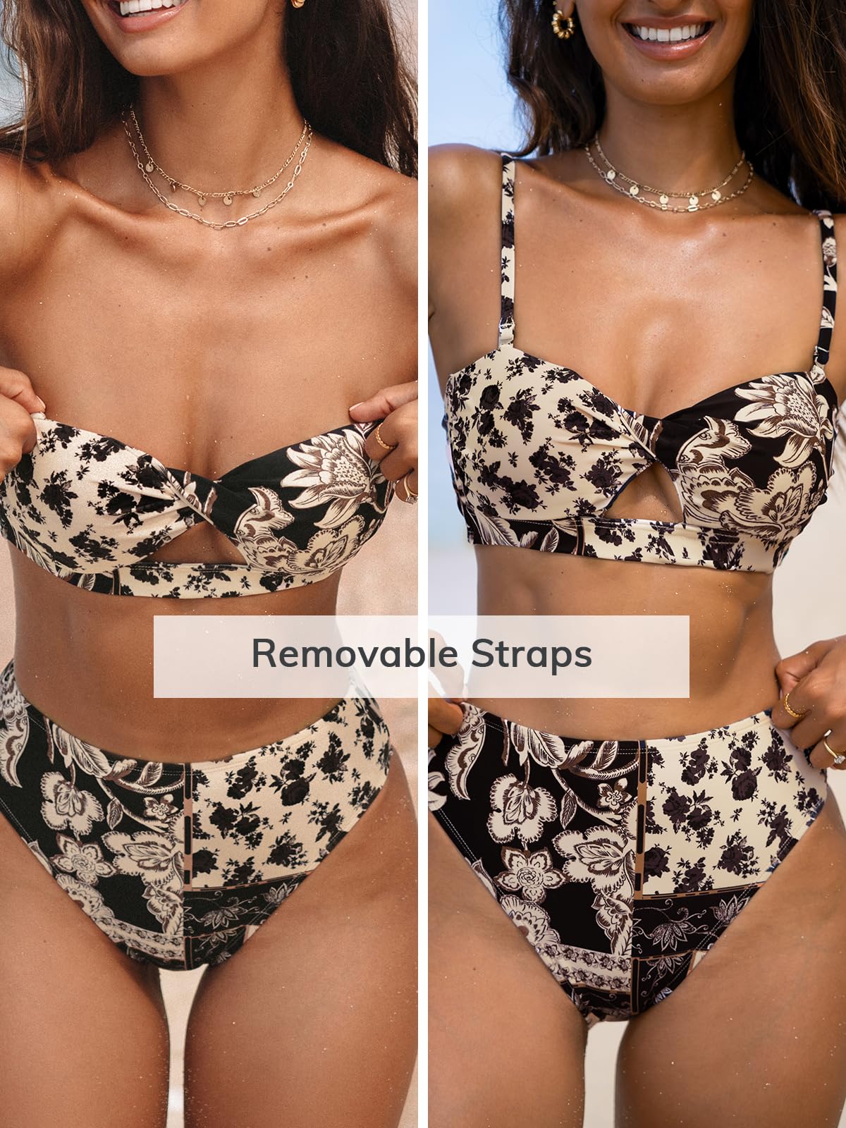 • Design: The Boho Two Piece Swimsuit Features Square Neck, Front Twisted Cutout and Back Self Tie Designs. Adjustable and Removable Shoulder Straps Makes the Bikini Top into a Bandeau. High Waisted Bottom Offers a Modern Silhouette.