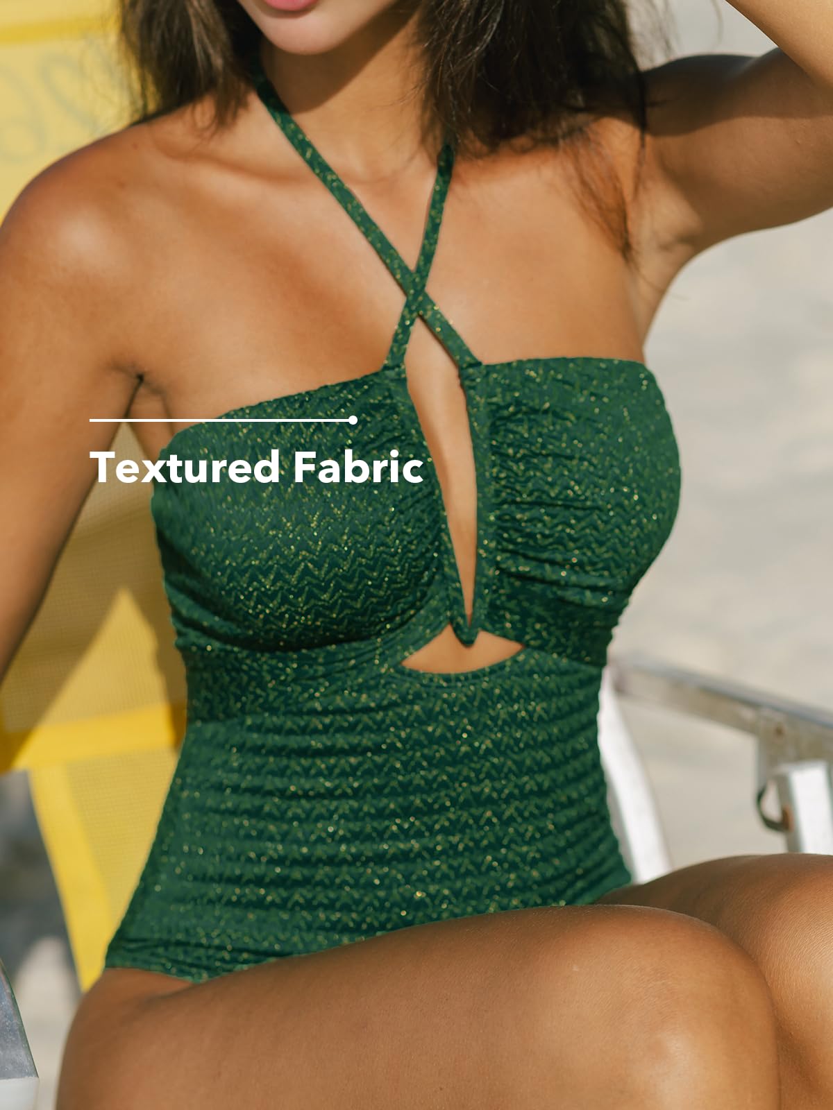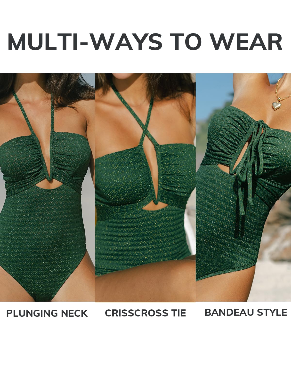 • Design: This One Piece Swimsuit Features a Plunging V Neck Halter with Front V Wire and Convertible Straps for Three Stunning Styles. The Front Cutout and Back Tie Add a Flirty Touch, While the Jacquard Sparkle Fabric Ensures You Shine.