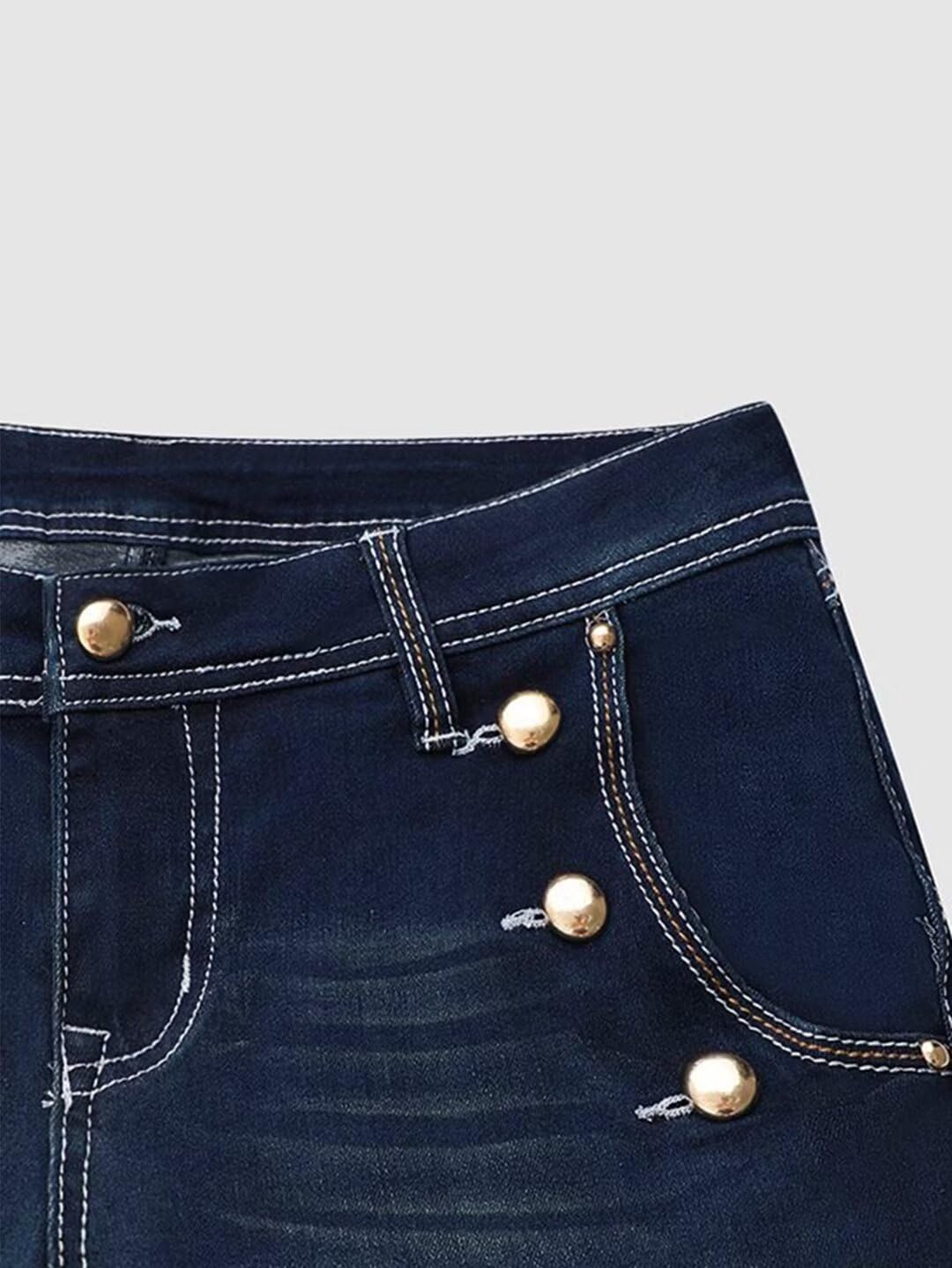 Flamingals Double Breasted Low Waist Embroidery Bootcut Jeans for Women Navy Blue L