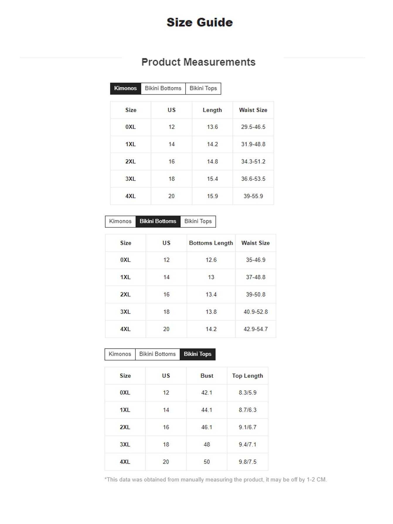Large Plus: Bust: 42.1", Top Length: 8.3/5.9", Bottoms Length: 12.6", Waist Size: 35-46.9", Length: 13.6", Waist Size: 29.5-46.5"