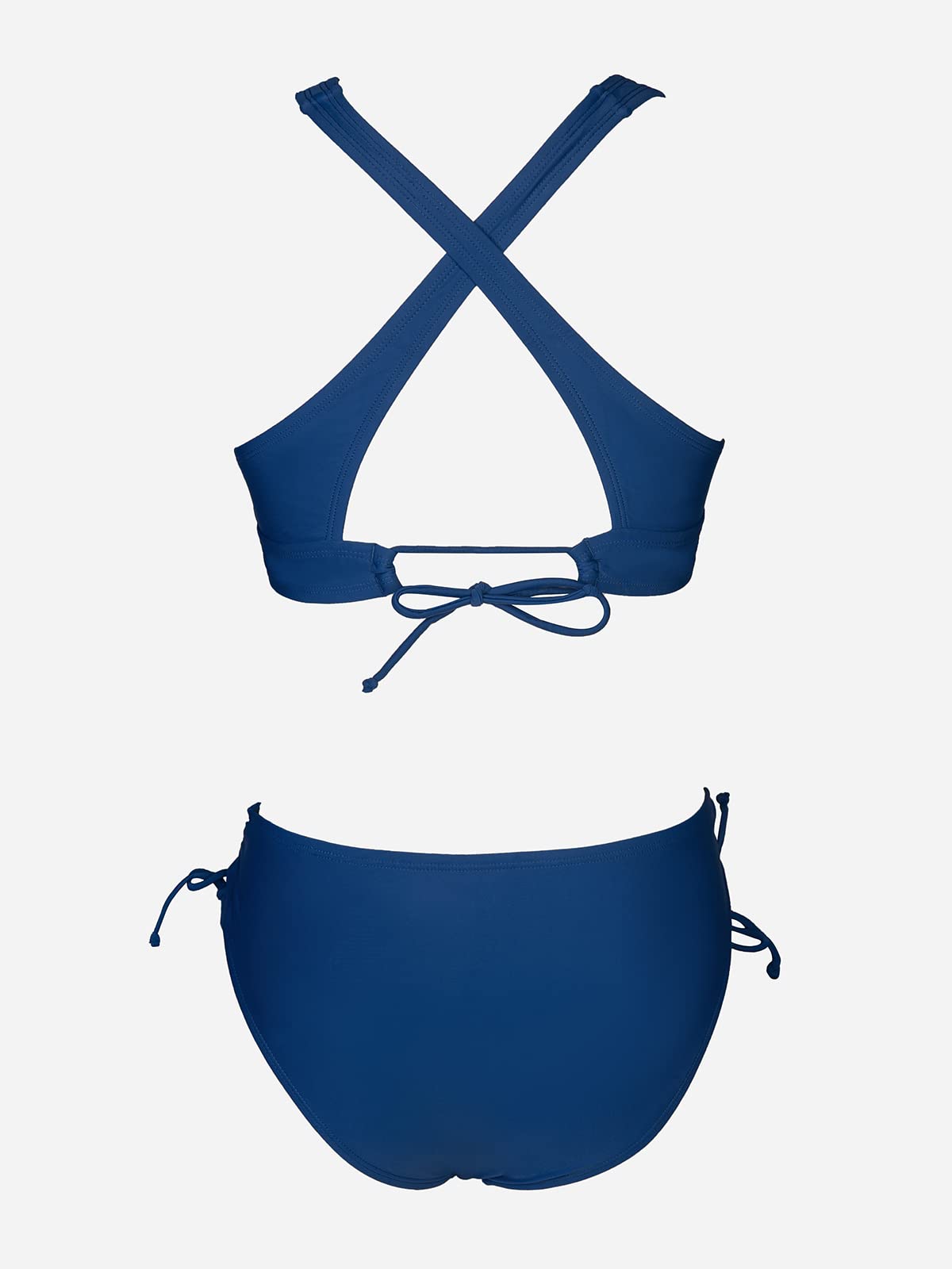 • Design: Splash and play all day in this bikini set featuring a top with a triangle silhouette, plunging v neck, and wide straps that form a crisscross back, as well as a matching pair of hipster bottoms with a mid rise waist and adjustable lace up sides.