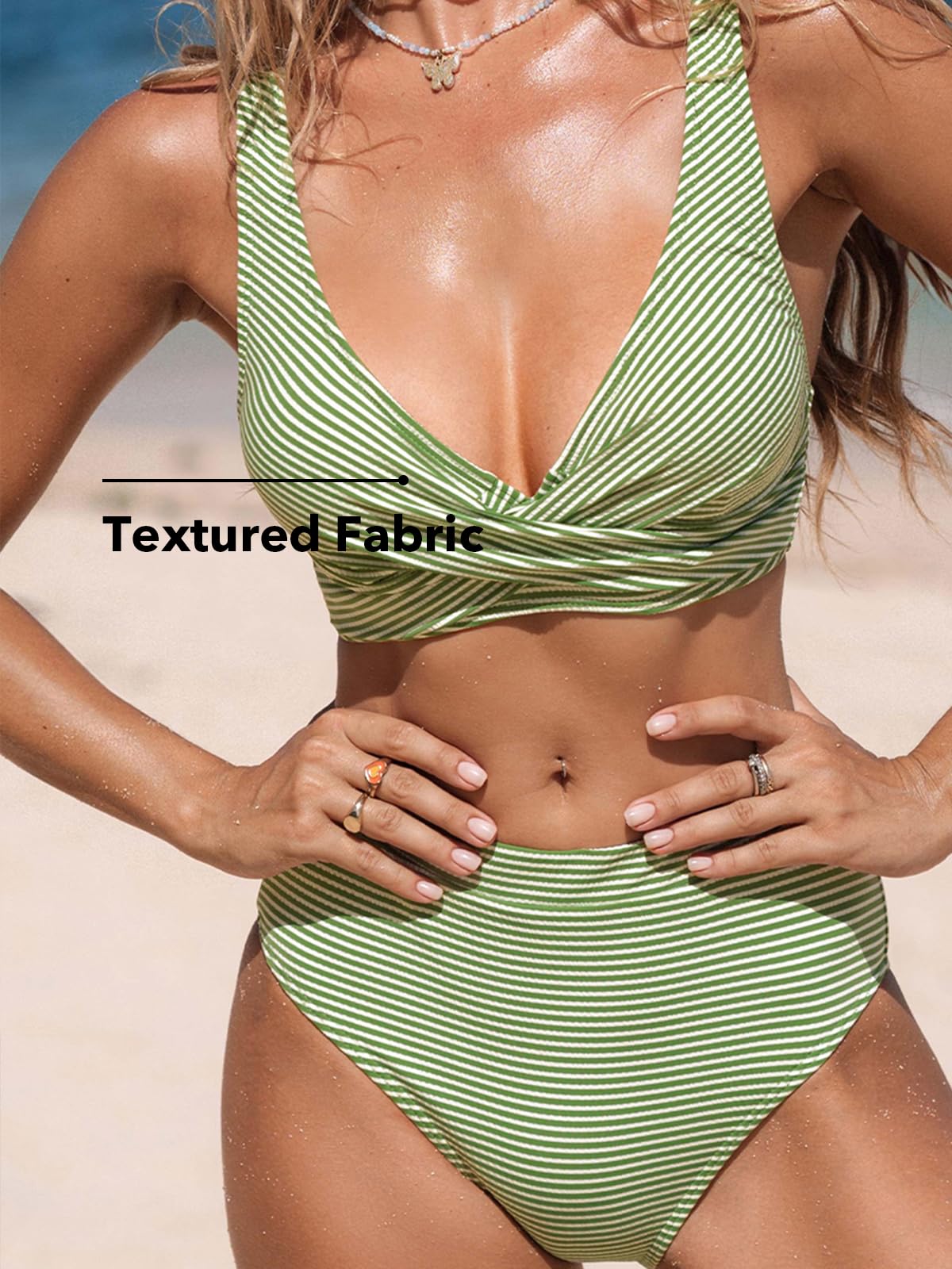 • Design: This Bikini Set Boasts a High Waisted Bottom and a Striking Plunging V Neck Top with a Front Twist Wrap for a Flattering Silhouette. The Textured Fabric and Wide Adjustable Straps Ensure Both Comfort and Style.