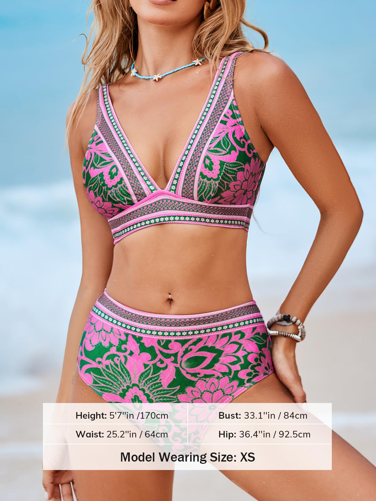 CUPSHE Women's Bikini Sets Two Piece Bathing Suit High Waisted Plunging V Neck Wide Straps Back Hook, M