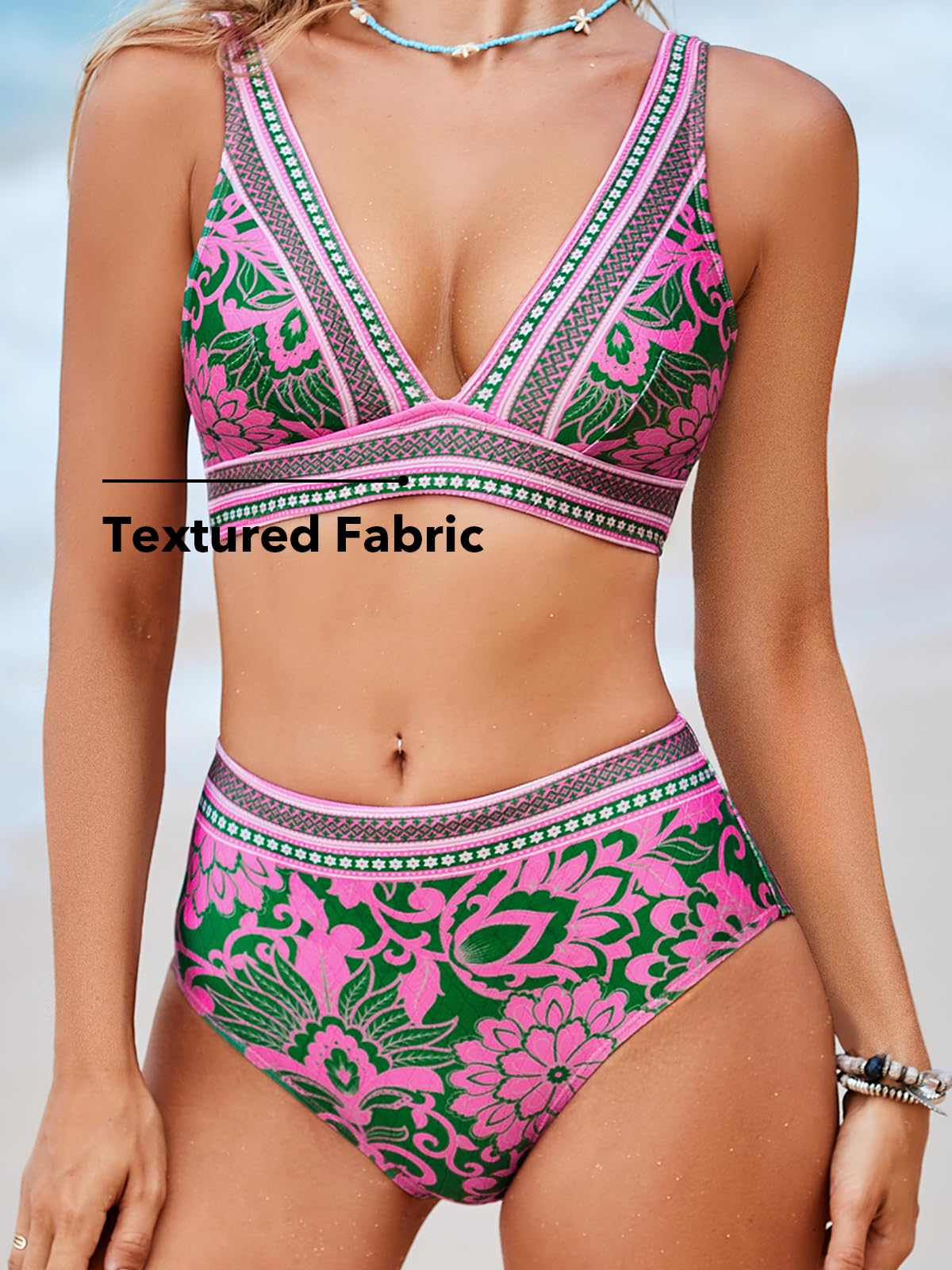 • Design: This High Waisted Bikini Set Boasting a Seductive Plunging V Neck and Supportive Wide Straps. The Textured Fabric Adds Depth and Appeal, While the Secure Back Hook Ensures a Perfect Fit for All-Day Comfort. Cup: Removable Soft Cups.