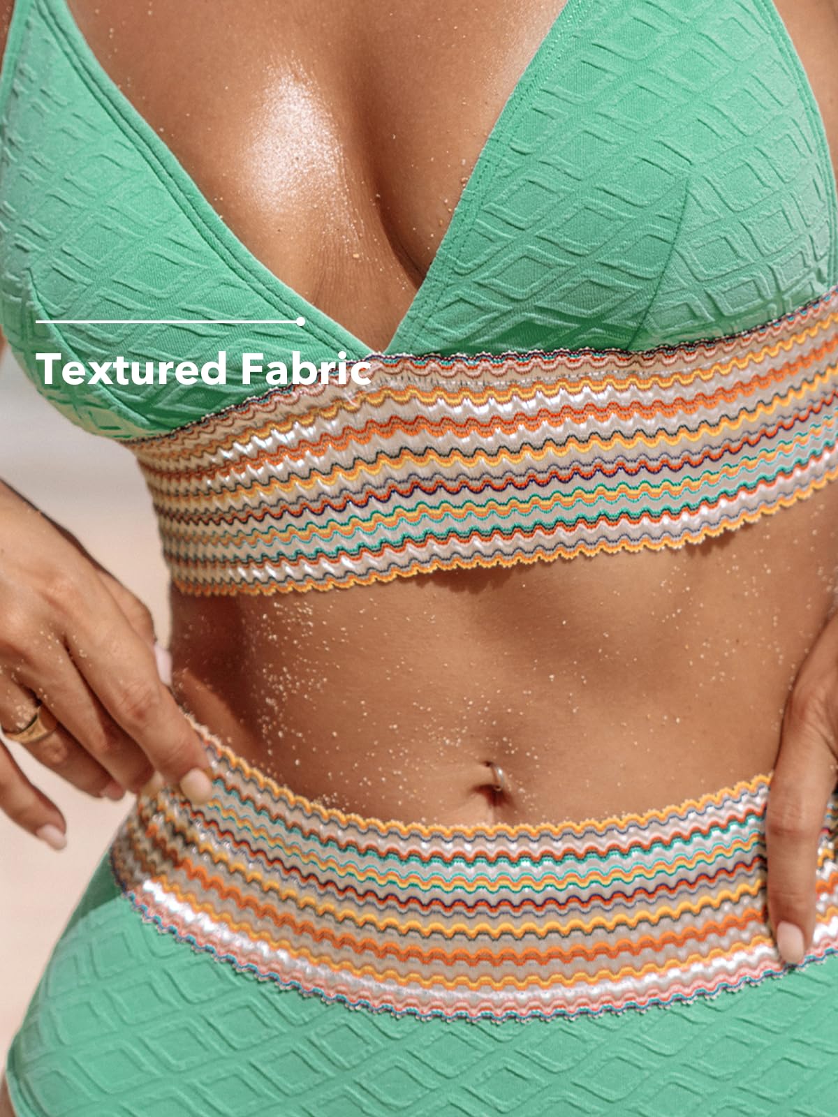 • Design: This plunging neck with jacquard fabric bikini sets can freshen up your swimwear collection. This chic color block two piece swimsuit ensemble features high waisted cheeky bottom and adjustable straps design make you looks flattering.