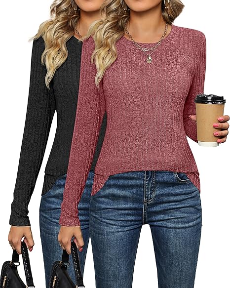 Ficerd 2 Pack Women's Sweaters, Fall Long Sleeve Fitted Sweaters Cable Knit Light Tunic Tops Crew Neck Sweaters 2024 Trendy
