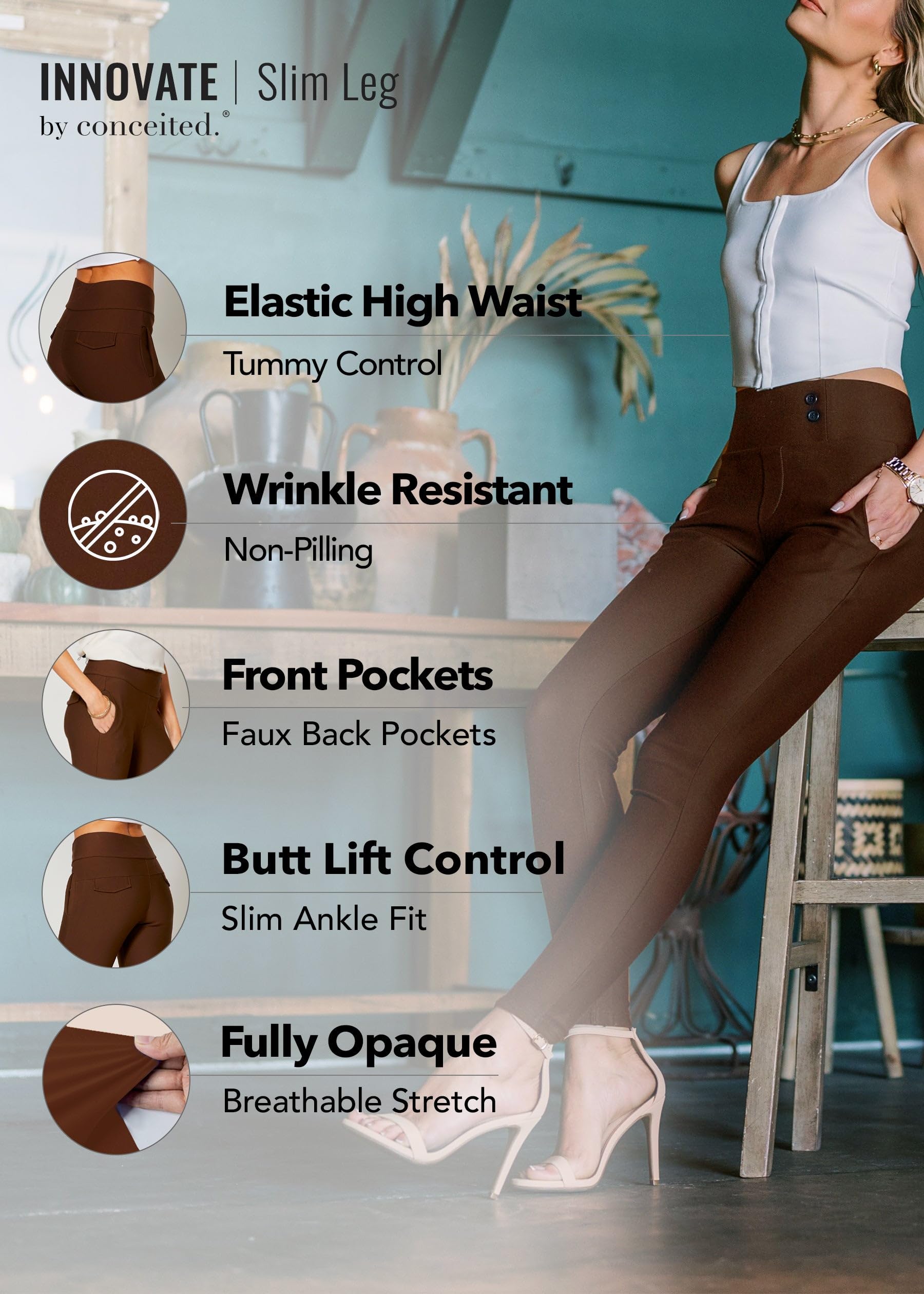 Conceited Premium Women's Stretch Dress Pants - Wear to Work - Ponte Treggings - Slim Leg with Buttons - Brown - DP-SlimButtons-Brown-L