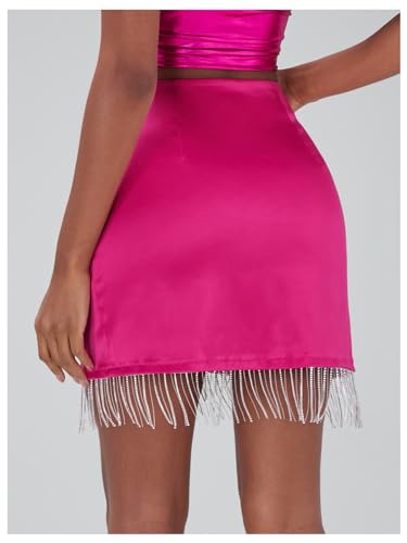 BEAUDRM Women's Rhinestone Fringe Trim Short Skirt High Waist Wrap Bodycon Mini Skirts Hot Pink X-Small