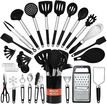 40PCs Silicone Cooking Utensils Set 446___ Heat Resistance, RFAQK BPA Free Kitchen Utensils Set for Nonstick Cookware, Gadgets includes Can Opener, Potato Smasher, Peeler, Tongs, Spatula Set, Pizza Cutter