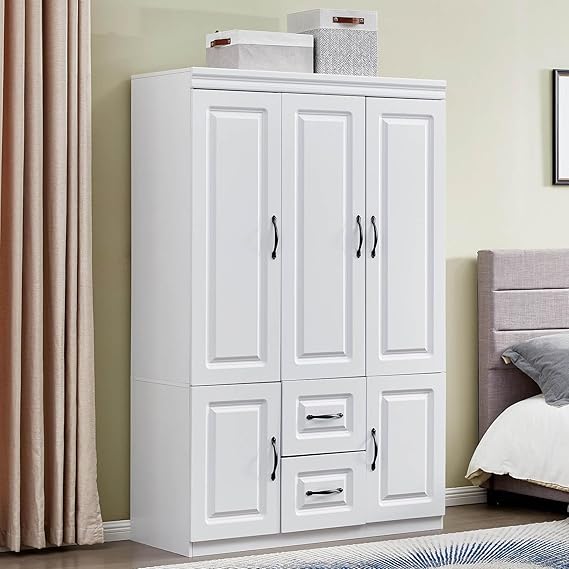 71''H Closet Wardrobe Closets 3 Doors Armoire Wardrobe Closet Wood White Storage Closet Wardrobe Cabinet Bedroom Armoires with Hanging Rod 2 Drawers Clothes Wooden Cabinet