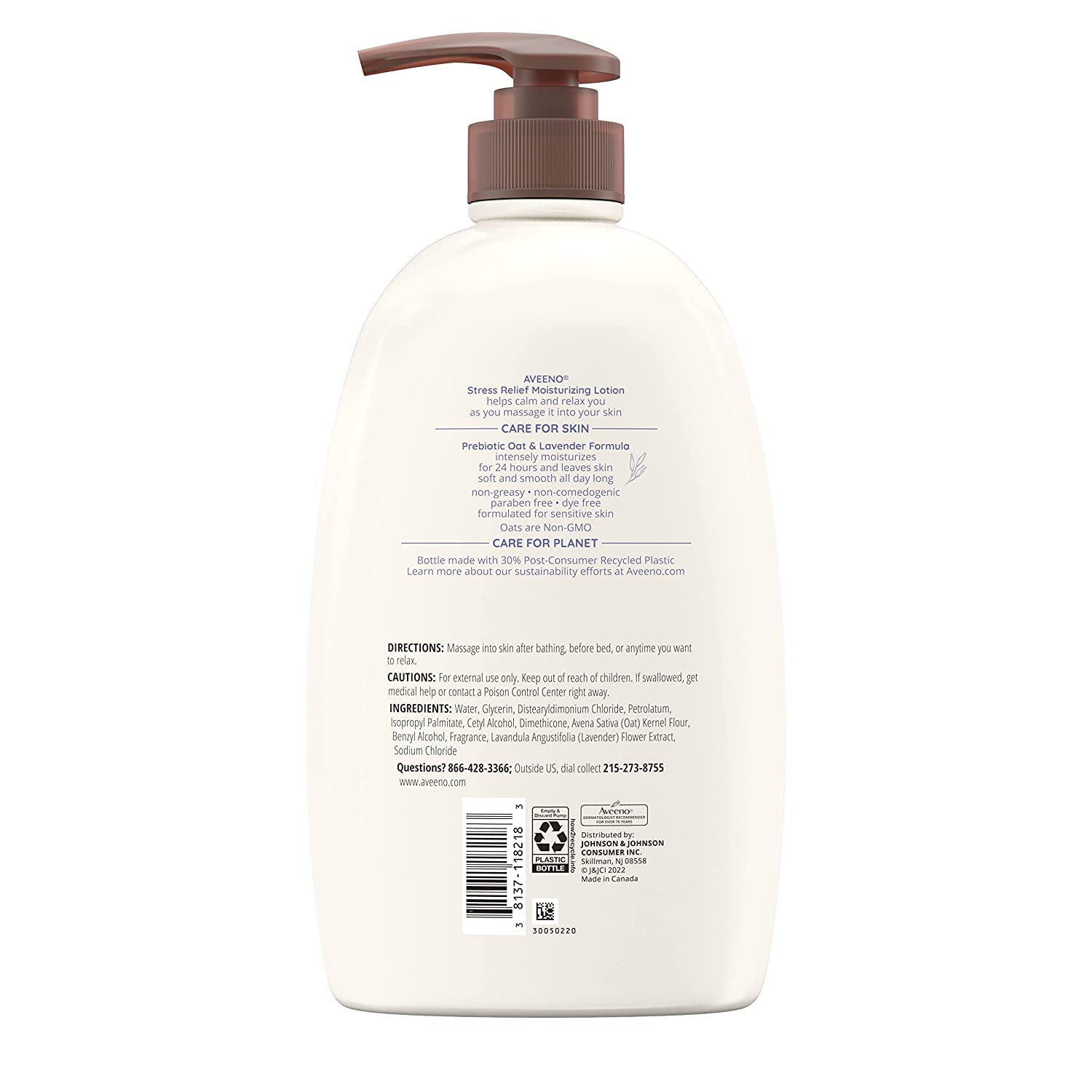 Aveeno Stress Relief Moisturizing Body Lotion with lavender scent and prebiotic oat helps calm and relax you while moisturizing for a full 24 hours to leave skin soft and smooth. Using the goodness of nature and the power of science, this soothing daily body lotion is made with prebiotic oat and intensely hydrates skin, leaving it feeling soft and smooth. It also combines the calming scent of lavender and prebiotic oat to help calm and relax you as you massage it into your skin to help you unwind and lock in moisture. This lavender scented body lotion has a nourishing non-greasy formula that absorbs quickly for lasting moisture throughout the day and is from Aveeno, a dermatologist recommended brand for over 70 years. This moisturizing stress relief lotion is formulated for sensitive skin and is non-comedogenic, paraben free, dye free, and gentle. This bottle is made with 30% Post-Consumer Recycled Plastic.