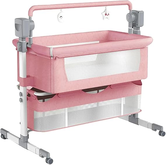 Baby Bedside Crib Multifunctional Bassinet for Co-Sleeping Convertible Bedside Cot Foldable Infant Bedside Sleeper Toddler Cradle with Bluetooth Music 5 Swaying Gears Remote Control (601 Pink)