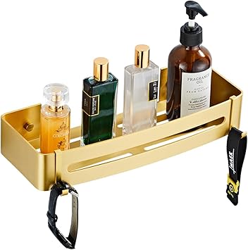 Brushed Gold Shower Shelf Adhesive or Drilling Shower Caddy Bathroom Cosmetics Holder with Hooks Shampoo Holder