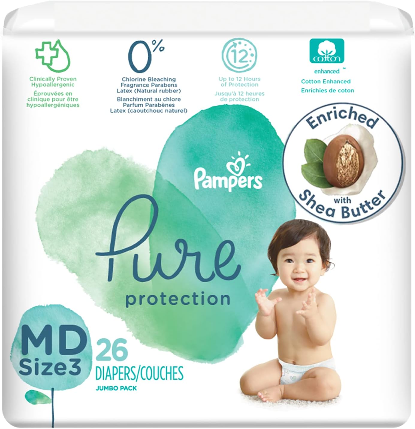 Your search for pure protection that works is over! Designed to help skin stay dry and healthy, Pampers Pure Protection diapers lock wetness away from skin for up to 12 hours for outstanding leakage protection with skin-loving care. Plus, our designer, boutique prints make Pampers Pure just as precious as they are protecting. We’ve thoughtfully chosen all of our ingredients to care for your baby’s precious skin. Our exclusive, plant-based liner** is enriched with shea butter to help nourish and protect skin while our outercover is enhanced with premium cotton, making Pampers Pure Protection diapers irresistibly soft and breathable. But the ingredients we’ve chosen to leave out are just as important. That’s why Pampers Pure Protection diapers are free of elemental chlorine, fragrance, parabens, and latex* and are hypoallergenic. *Natural rubber **Plant-based and polypropylene blend The Seal of Cotton and cotton enhanced are trademarks of Cotton Incorporated. cotton enhanced™ soft outercover contains 15% cotton.