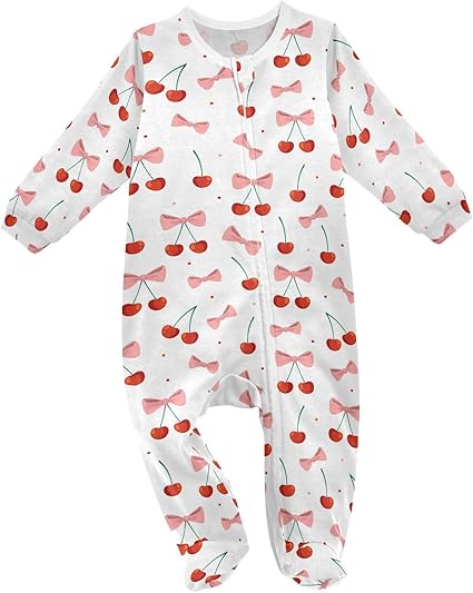 Dussdil Pink Coquette Bows Red Cherries Baby One-Piece Footies Newborn Rompers Pajamas Cotton Footed Pjs for Boys Girls