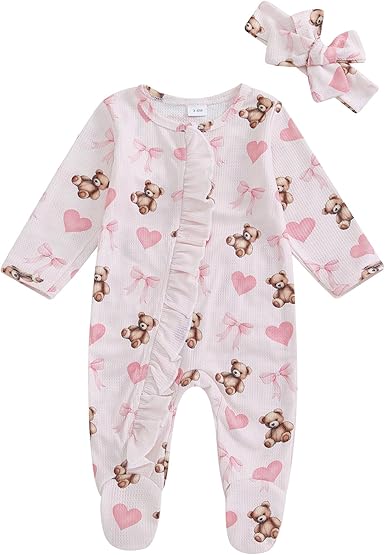 Eadrioss Valentines Baby Girl Outfit Waffle Heart Ruffle Romper Footies Jumpsuit Newborn Infant Girl Valentines Day Clothes