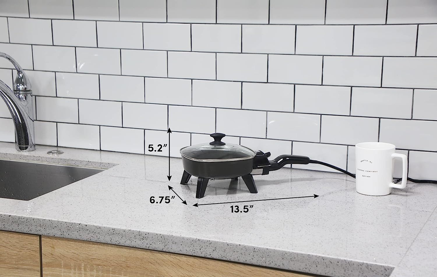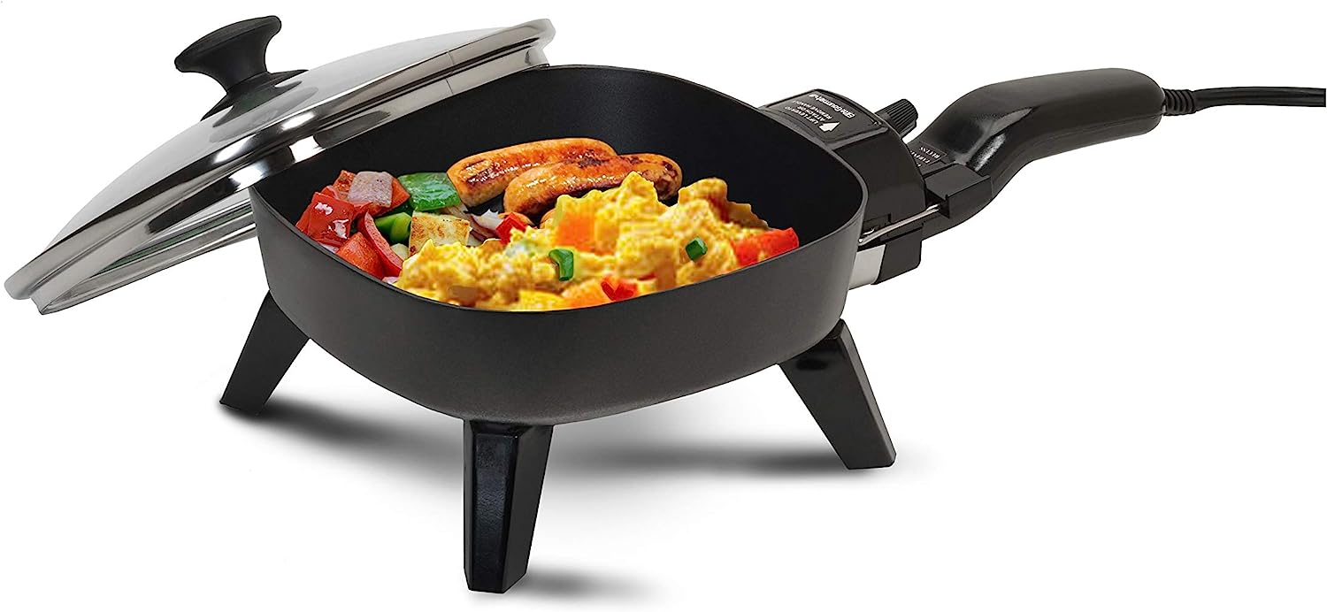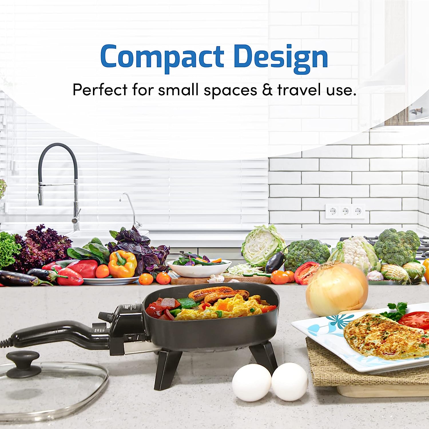 The Elite Cuisine 6.75” Electric Skillet is small and compact making it the perfect appliance to bring on camping trips, RV road trips, or for preparing small servings and solitary meals. Skillet has a 32 ounce capacity with non-stick cooking surface for easy cleaning. There is a removable locking handle and tempered glass lid with cool-touch knob. Adjustable temperature control for cooking versatility. After cooking, remove the handle from the skillet and clean-up is quick and easy. This mini skillet has all the features of larger skillets but its convenient small size is perfect for scrambling eggs, frying bacon, or making mini pancakes.