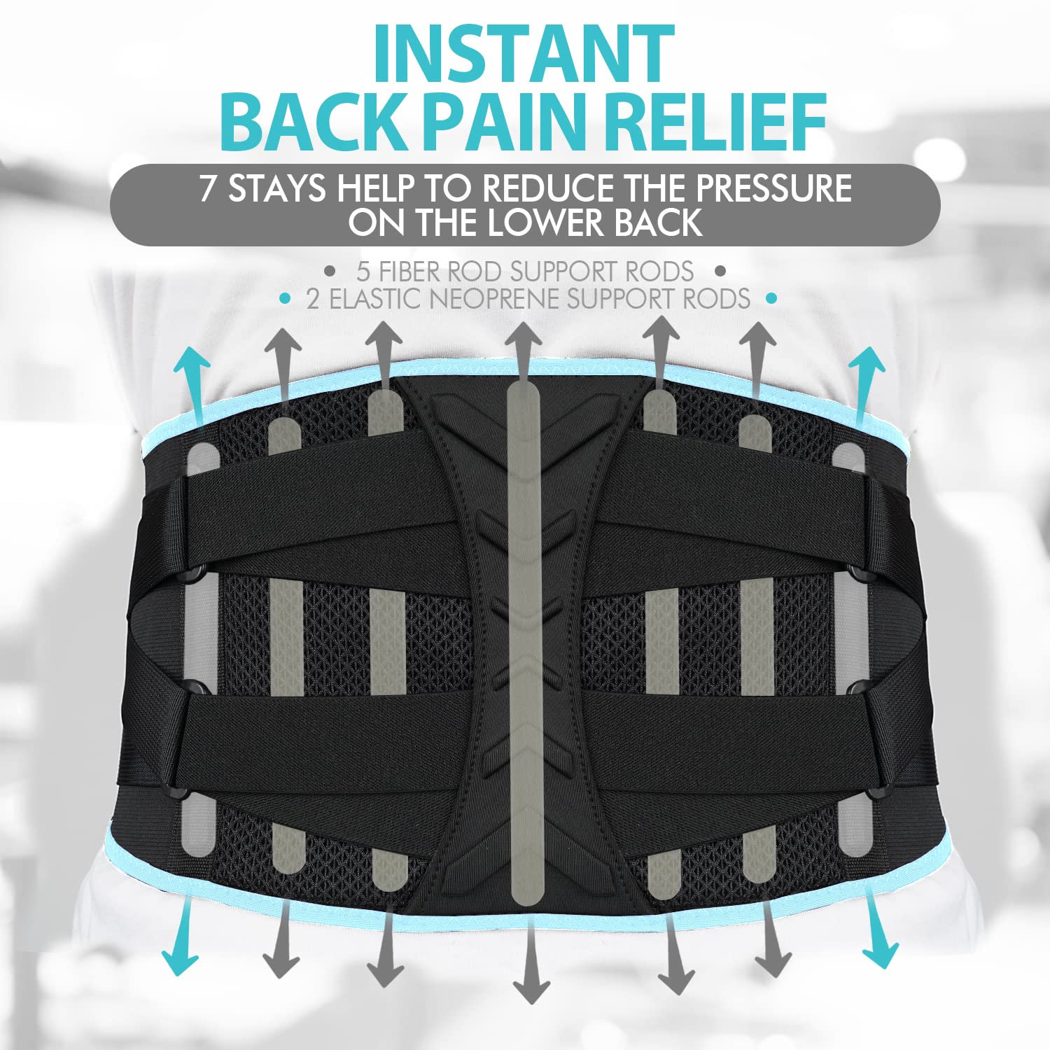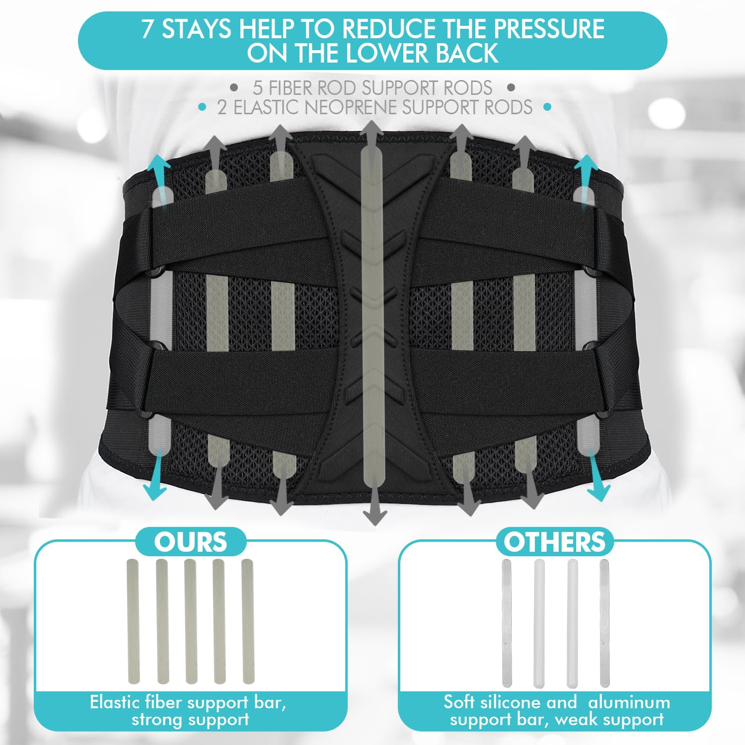 • 【7 STAYS and 360°STRONG SUPPORT】Back brace for lower back pain women with built-in 5 fiber rod support rods which is stronger than aluminum support bars, and 2 steel springs placing along the lumbar side provides 360° strong vertical support for your lower back. Fits the waist for maximum support and prevents over-rolling your muscles to reduce lower back pressure.