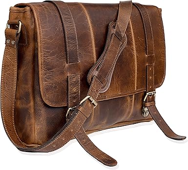 Leather Mens Retro Brown Laptop Messenger Bag Vintage Leather Laptop Briefcase Large Satchel Shoulder Bag With Trolly Strap