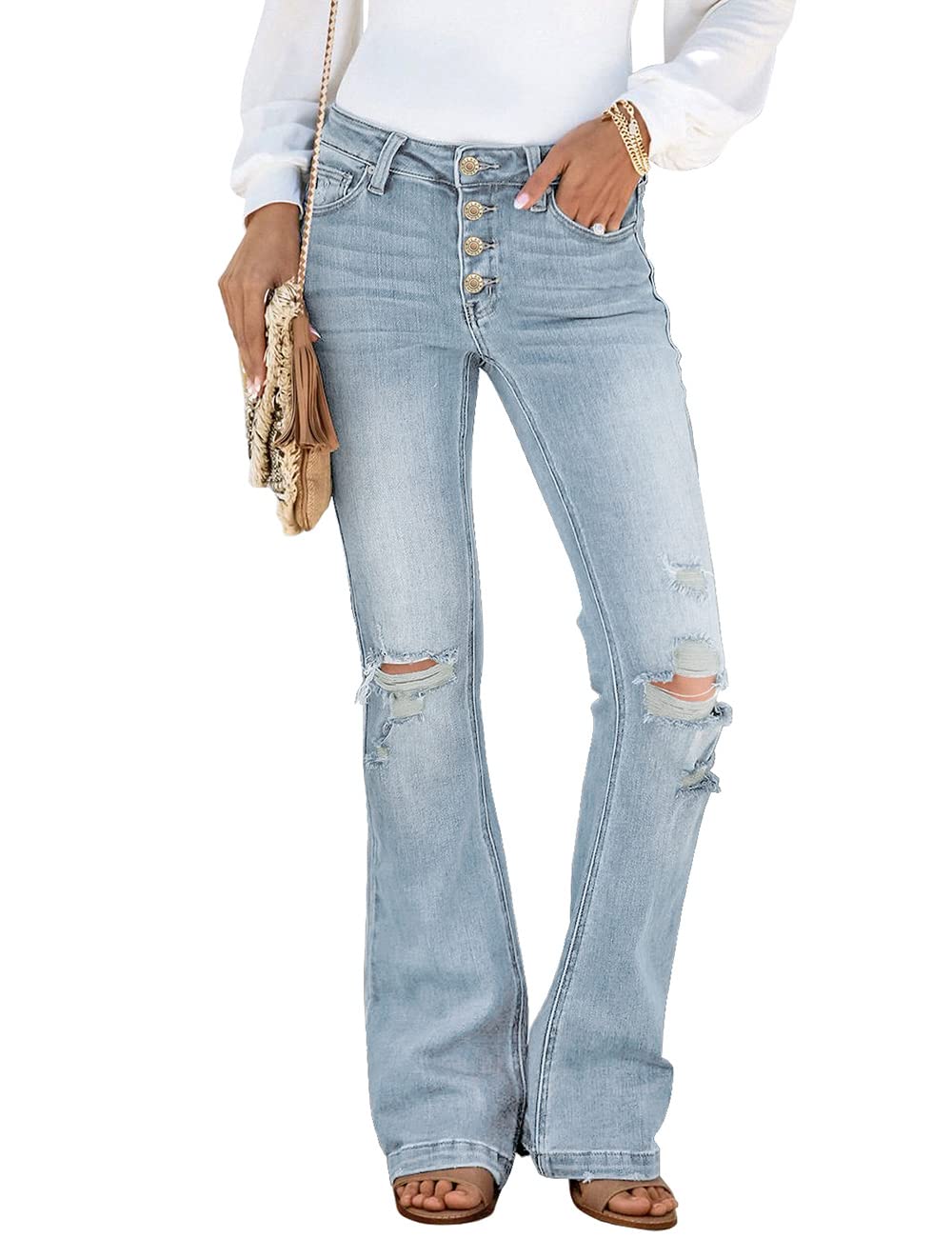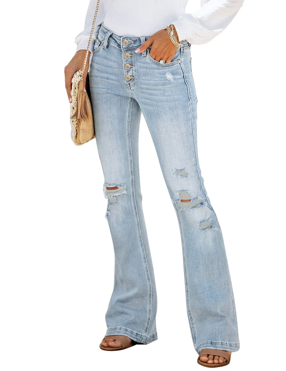 • Discover a pair to add your denim collection. women's flare jeans is a perfect modern take on retro style. The classic flare denim pants features ripped holes at the knee, fitted thigh and wide, flared leg.