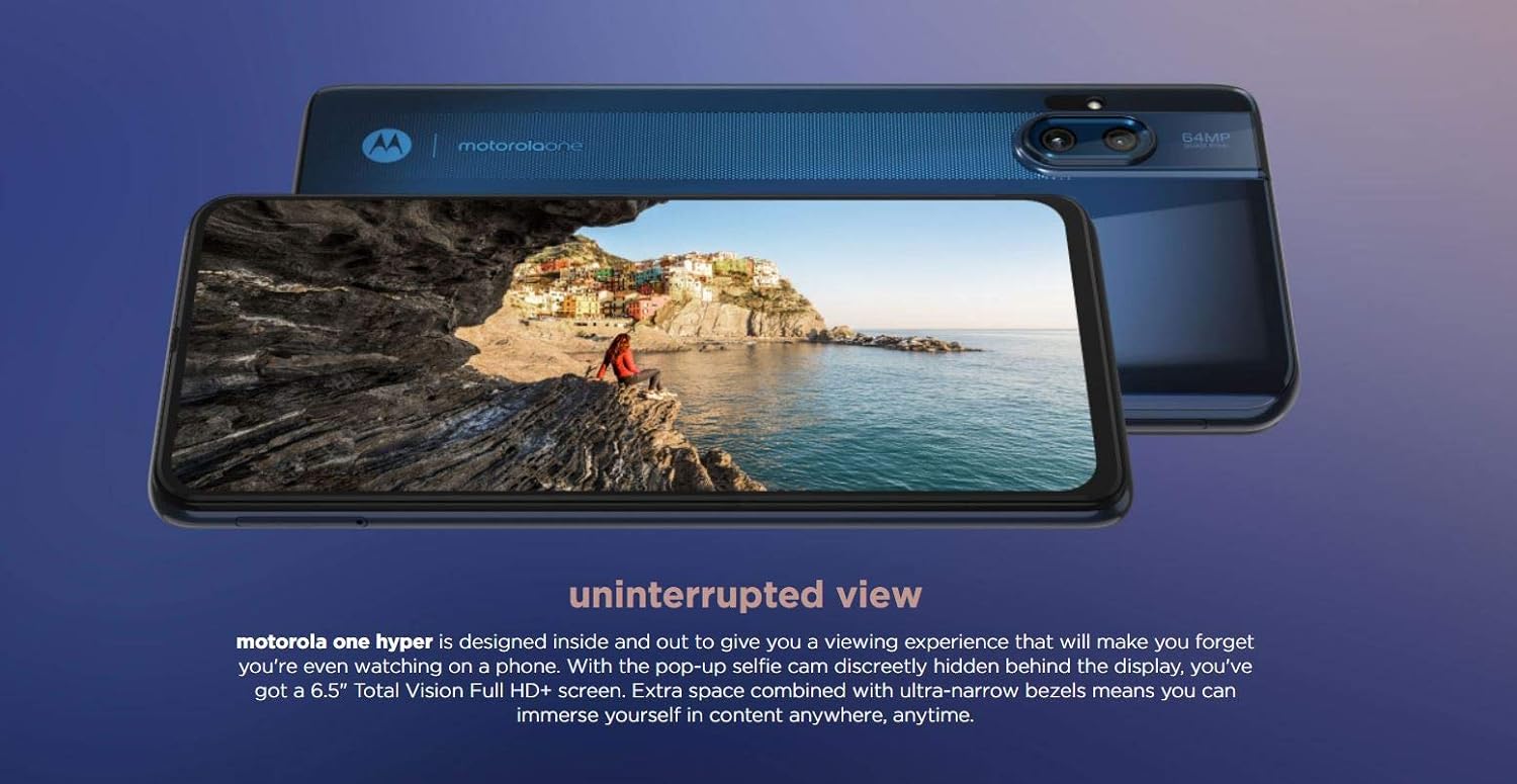 Hi-res detail low-light brilliance.Capture incredibly detailed, high-resolution 64 MP photos and 32 MP selfiesin any light, with Quad Pixel technology and Night Vision. Ultra-high res clarityThe 64 MP ultra-high-resolution sensor delivers crisp detail and color accuracy in every shot—even if you crop and enlarge. Thanks to laser autofocus technology, optimized to work in the dark, your camera instantly focuses on careful precision to deliver bright, vivid results...day or night. Make every pixel popSay hello to crystal-clear selfies with the reimagined selfie cam. Concealed behind the display, the 32 MP high-resolution camera pops up in less than a second. Go ahead, seize the selfie! 4x light sensitivityBoth the main camera and pop-up selfie cam feature Quad Pixel technology. By combining four pixels into one, it increases the camera light sensitivity which decreases visual noise caused by low-light conditions. The result? Brighter, more brilliant photos in any setting. Uninterrupted viewMotorola one hyper is designed inside and out to give you a viewing experience that will make you forget you're even watching on a phone. With the pop-up selfie cam discreetly hidden behind the display, you've got a 6.5" Total Vision Full HD+ screen. Extra space combined with ultra-narrow bezels means you can immerse yourself in content anywhere, anytime.