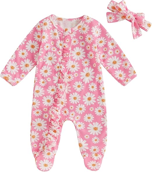 Newborn Baby Girl Clothes Fall Winter Long Sleeve Footie Romper Waffle Ruffle Zipper Jumpsuit Coming Home Outfit
