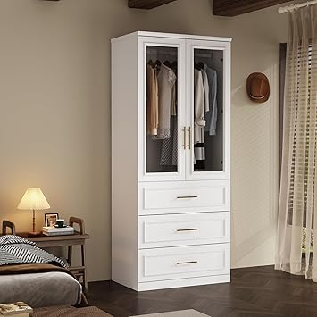 Wardrobe Closet with Hanging Rod, 3 Framed Drawers & 2 Glass Doors, Modern Wooden Armoire, Clothes Storage Cabinet Organizer for Bedroom Apartment, White