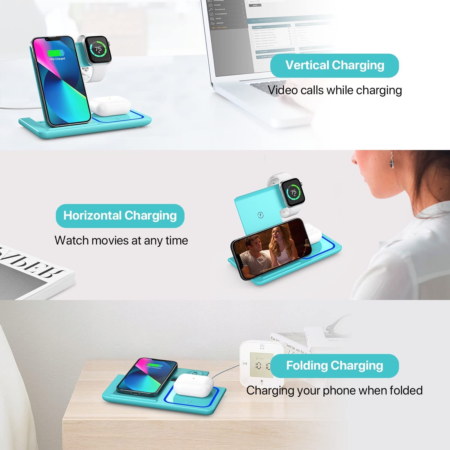 • 【Portable & Foldable Travel Charger Stand】The charging station for iphone is foldable, light and portable, and can be put in a bag or suitcase. This wireless charging pad is not only suitable for your home, office, if you are traveling or on a business trip, bring this 3in1 charger, which can charge multiple devices at once. Also, Versatile as a cell phone stand with angle adjustment. it's as a charging pad, just leave the phone flat to keep it charging.
