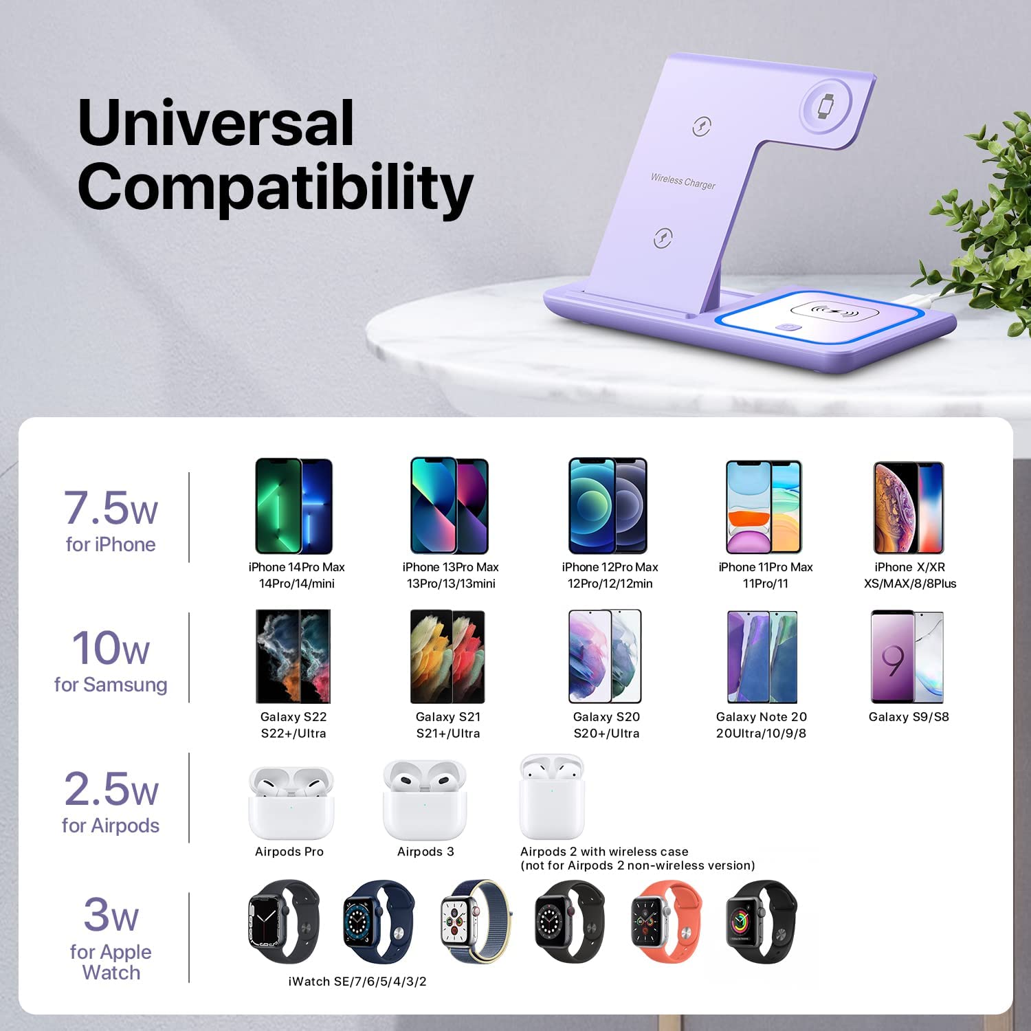• 【3 in 1 Wireless Charger】This charging station can charge most phones, support fast charging for multiple devices apple at the same time, compatible with iPhone 13/13Pro/13 Pro Max/12/12 Pro/12 Pro Max/SE/XR/X/XS/XS Max/11 Pro Max/11 Pro/11/8 Plus/8 or Android;Apple Watch 7/6/5/4/3/2/SE, Airpods Pro/3/2 with wireless case(not for Airpods 2 non-wireless version). A must device for apple fans. Say goodbye to individual chargers.