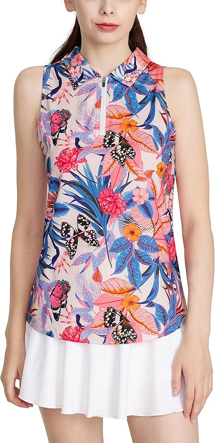 CQC Women's Sleeveless Golf Shirts Quick Dry Floral Athletic Polo with Collar Zip Up Lightweight Tennis Tank Tops