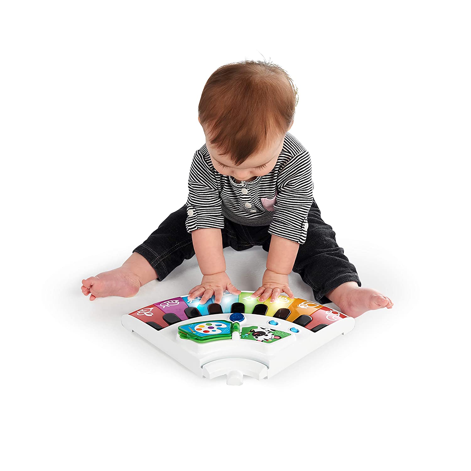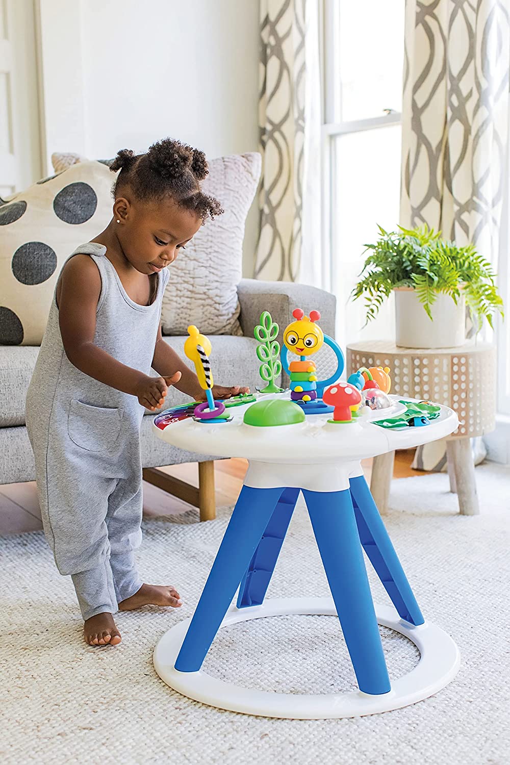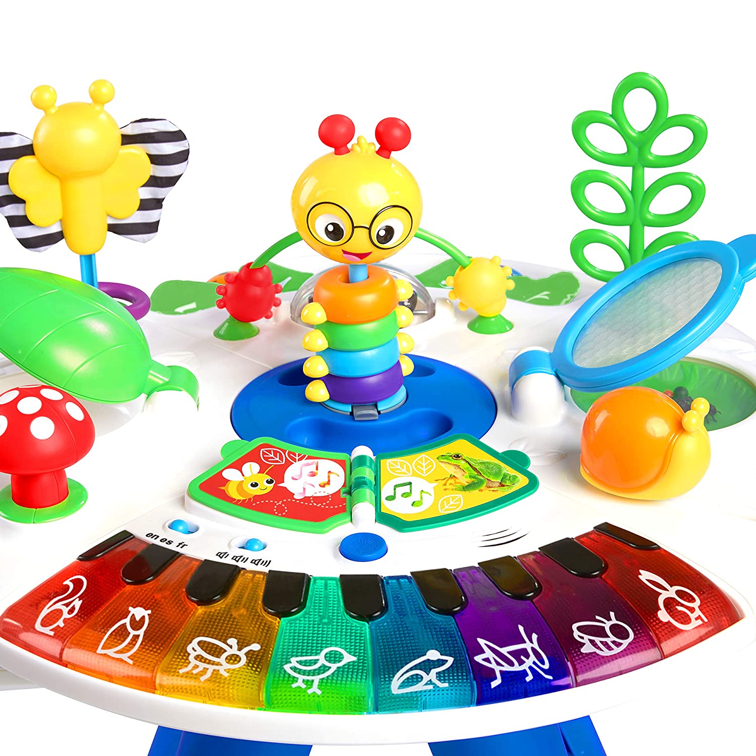The Baby Einstein around, we grow 4-in-1 provides a mix of physical and sensory experiences that promote movement and cognitive skills. Its four distinct ways to play—walk-around discovery center, discovery table, art table, and removable floor toys—will captivate your little one from 6 months up. From sitting to standing to walking, there's a mode for every stage. The innovative walk-around discovery center brings the benefits of a traditional baby walker and stationary entertainer together in one solution. The cushioned seat travels 360° around the activity table, supporting baby's first steps and empowering her to move and explore at her own pace (without wandering off). Fifteen nature-themed toys put sensory experiences at baby's fingertips and encourage the development of motor skills. Discover new sounds and languages with the full-octave piano that introduces music, animals and colors In English, Spanish, and French. The removable toy stations are great for floor play and keeping multiple kids engaged at once. Little ones will love drawing, painting, building, and creating at the art table. Assembly is quick and easy, and so is cleanup. The seat cover is machine washable, and you can wipe the activity station clean with a damp cloth.