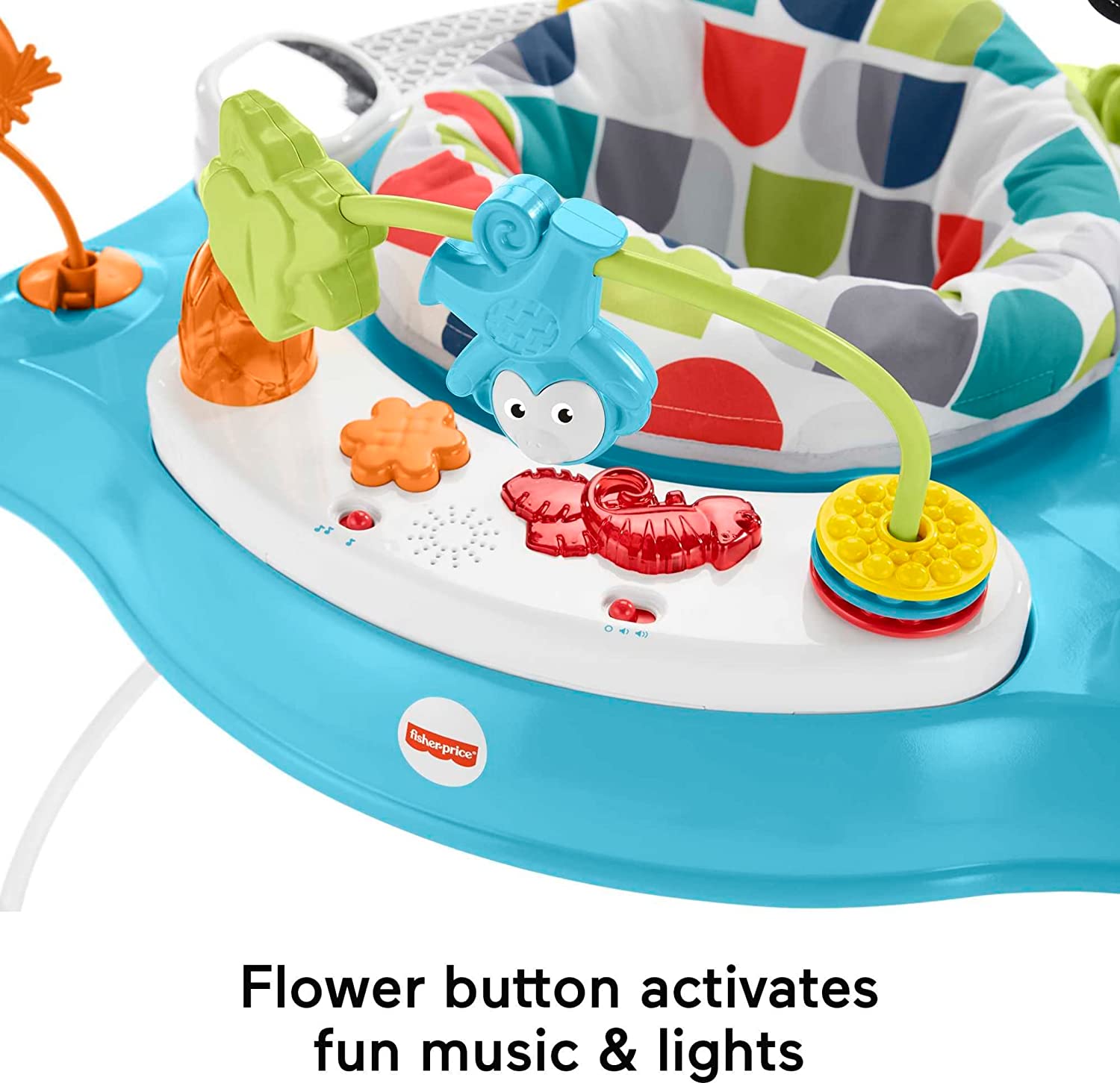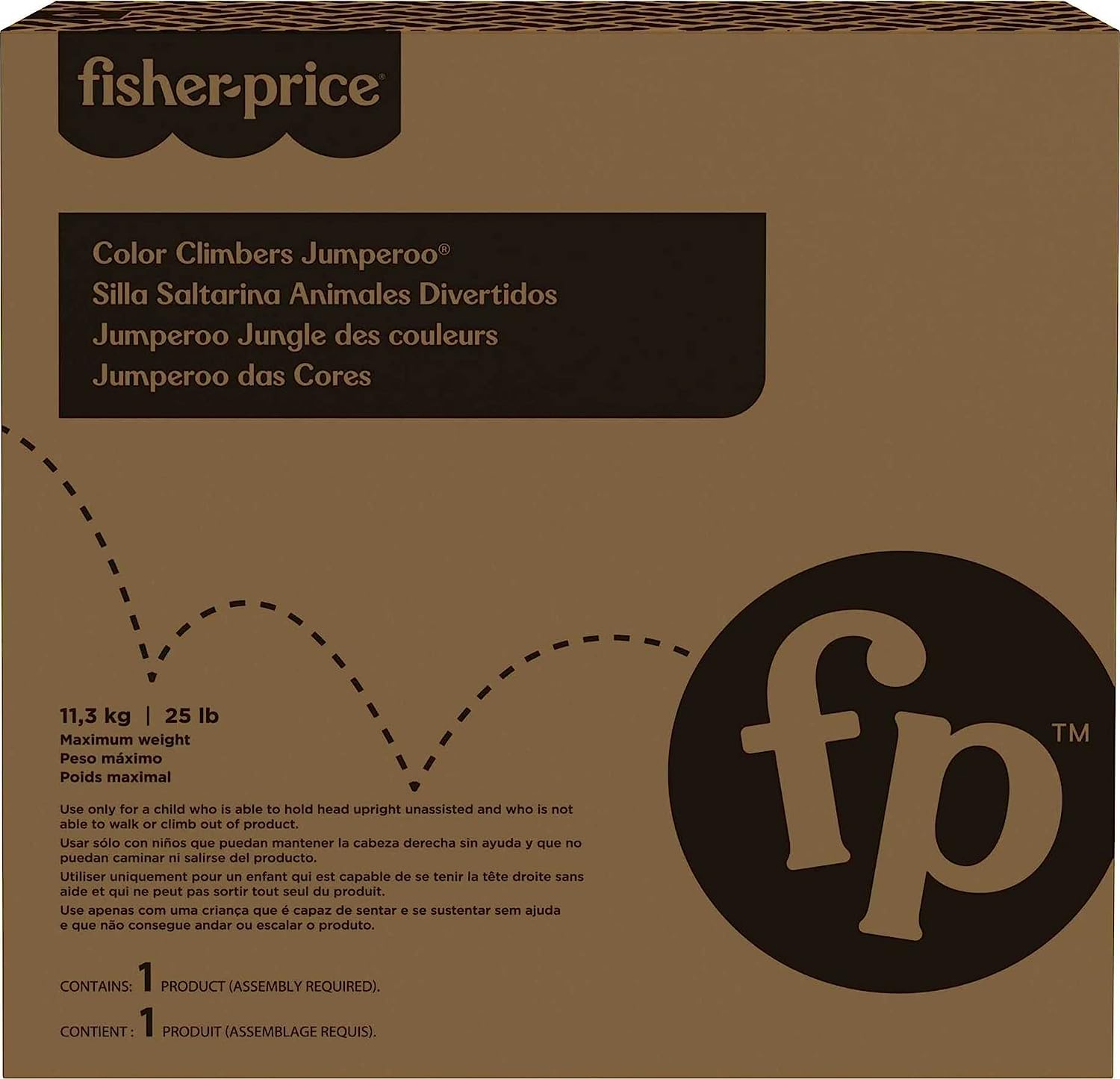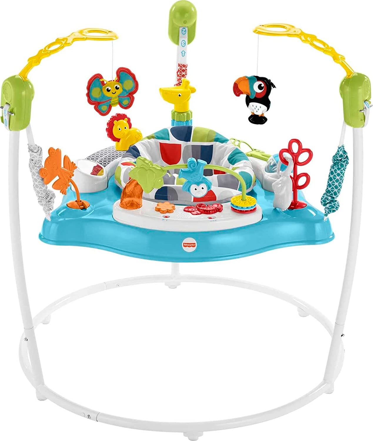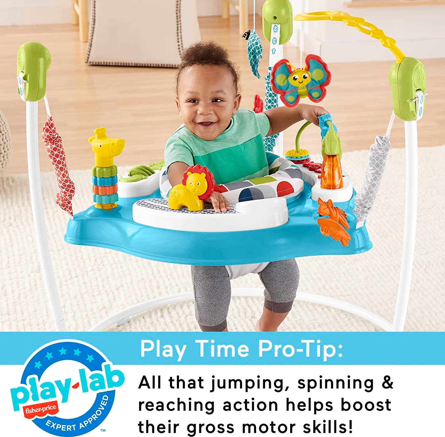Your baby will go wild visiting the Fisher-Price Animal Activity Jumperoo activity center! A rotating seat gives little ones 360-degree access to toys, activities and animal friends, including spinners, clackers, a bead bar, a mirror, and so much more. Tiny explorers will love discovering all the fun while music, lights, and sounds reward every jump. Max. weight 25 lb/ 11,3 kg. Use only for a child who is able to hold head upright unassisted and who is not able to walk or climb out of product.