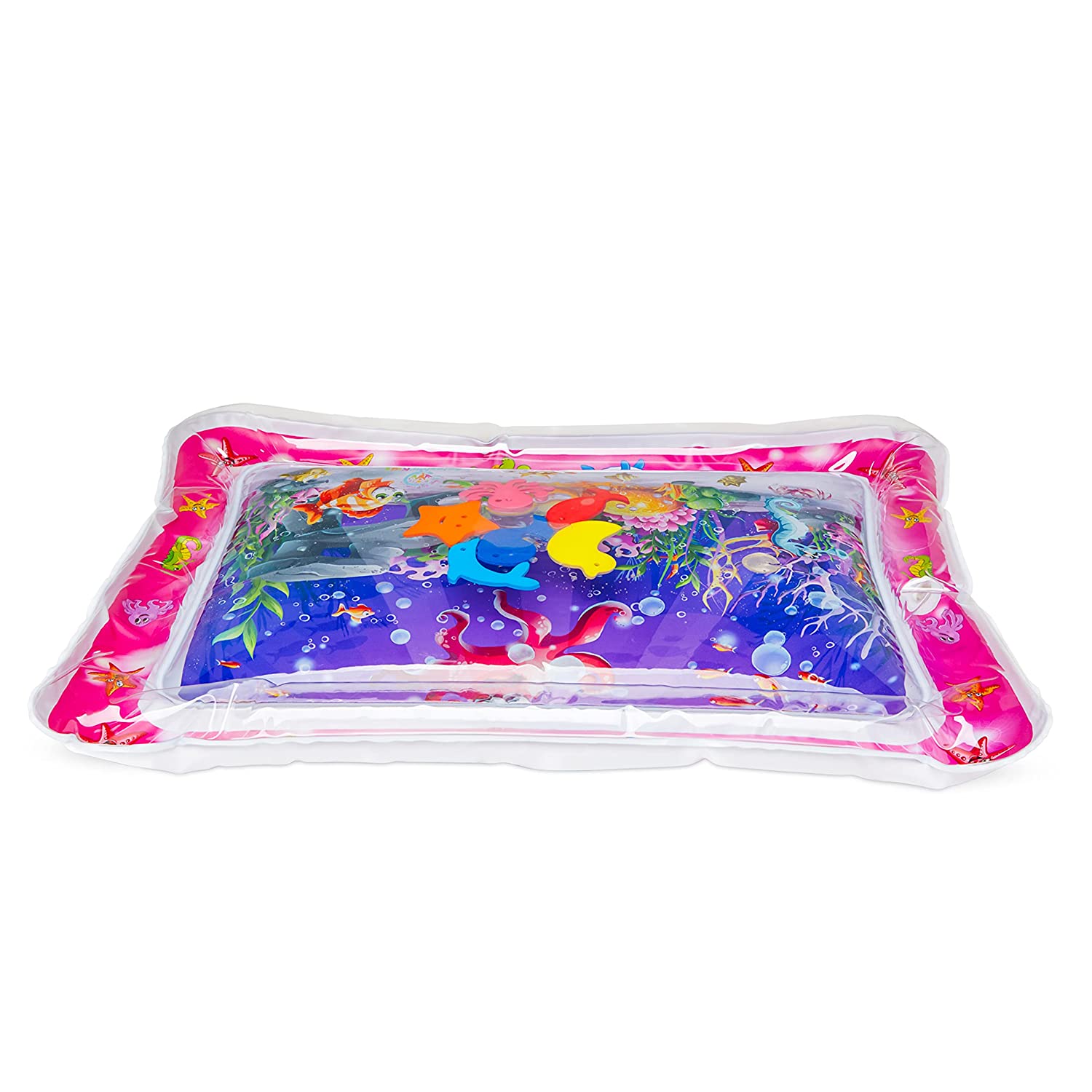 • { Stunning Eye Catching Graphics } Watch as your infant enters our fish tank Wonderland wide eyed and Fascinated by the bright colors sharp contrasts and cute floating toys Rain or shine is tummy time Your baby will try to catch and bat the brightly colored toys as they float by This baby splash pad will provide hours of quality stimulating and healthy fun