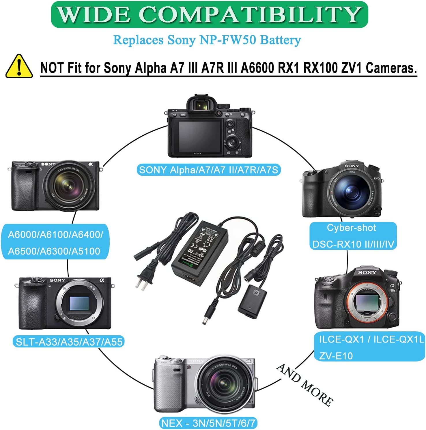 • [COMPATIBLE WITH:] The ac-pw20 Continuous power adapter np-fw50 ZVE10 dummy battery charger kit for Sony Alpha A6400, ZV-E10, A7, A7II, A6000, A6100, A6300, A6500, A5100, A5000, A7RII, A7SII, A7S, A7S2, A7R, A7R2, Cyber-shot DSC-RX10 II III IV, NEX-3, NEX-5, NEX-5A, NEX-5C, NEX-6, NEX-7 Cameras and more.