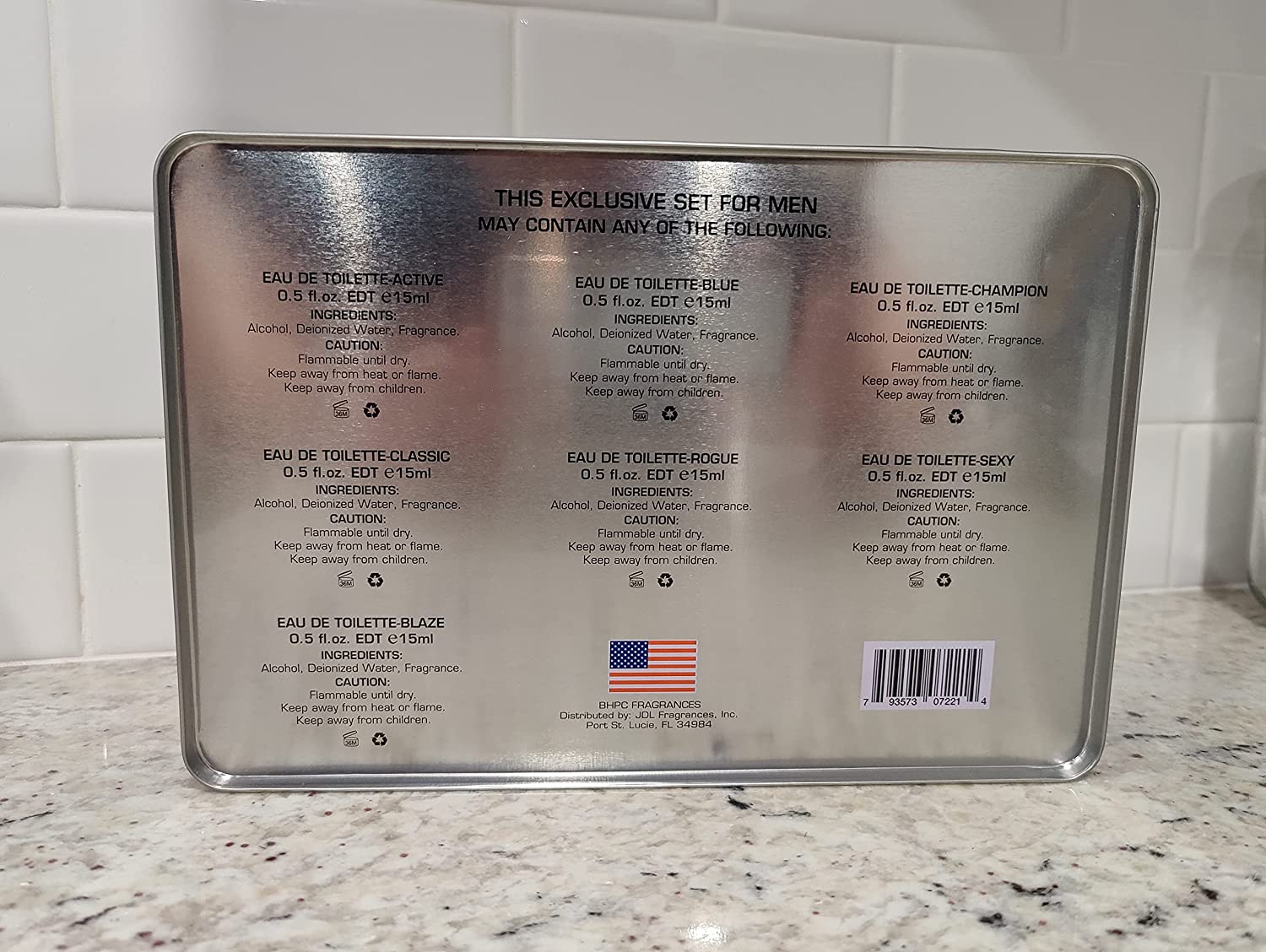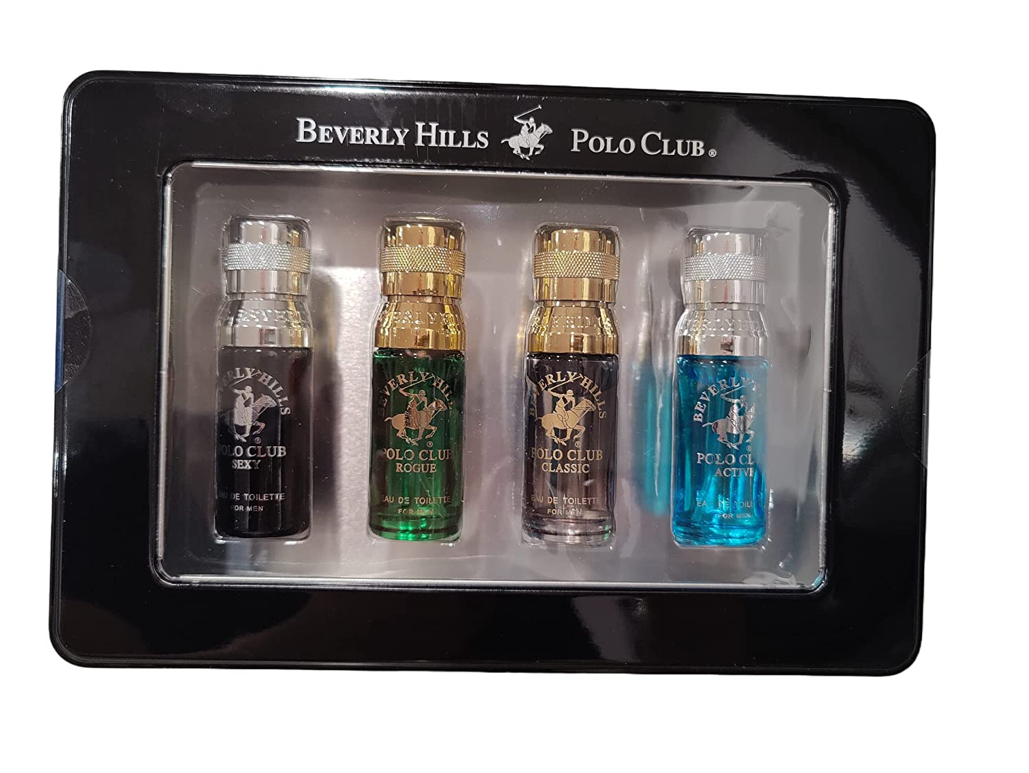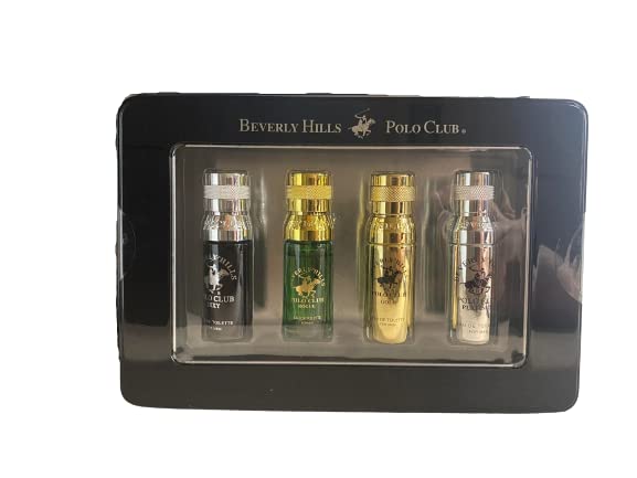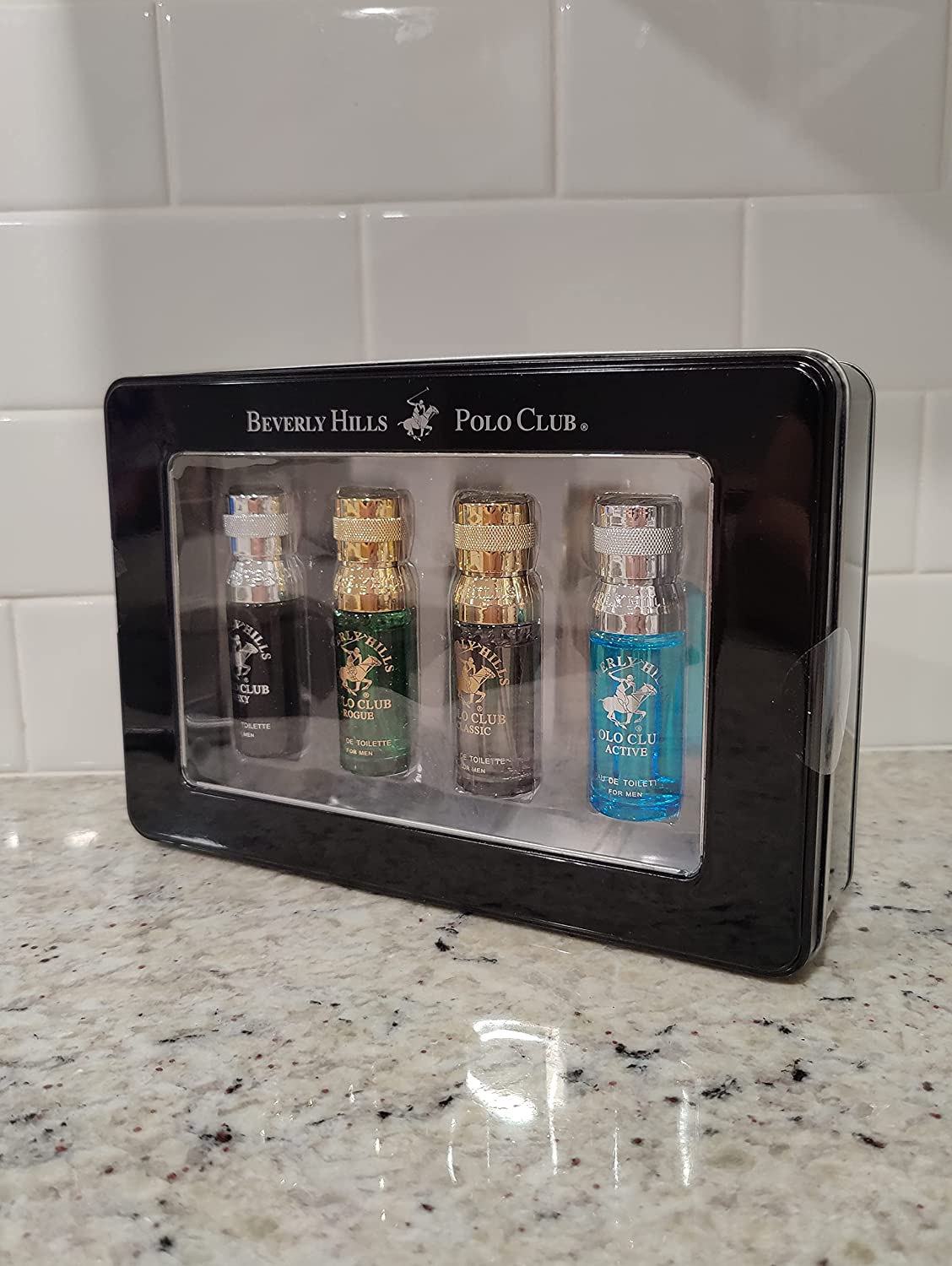 Set of 4 0.5z Eau De Toilette Colognes for Men From BHPC Beverly Hills Polo Club Men's Collection, in a deluxe tin gift set box. Perfect for any giftable holiday for the man you are purchasing for. It contains any of the following Beverly Hills Polo Club Classic, Rogue, Active, Sexy, Blaze, Blue, Champion, Gold and Platinum