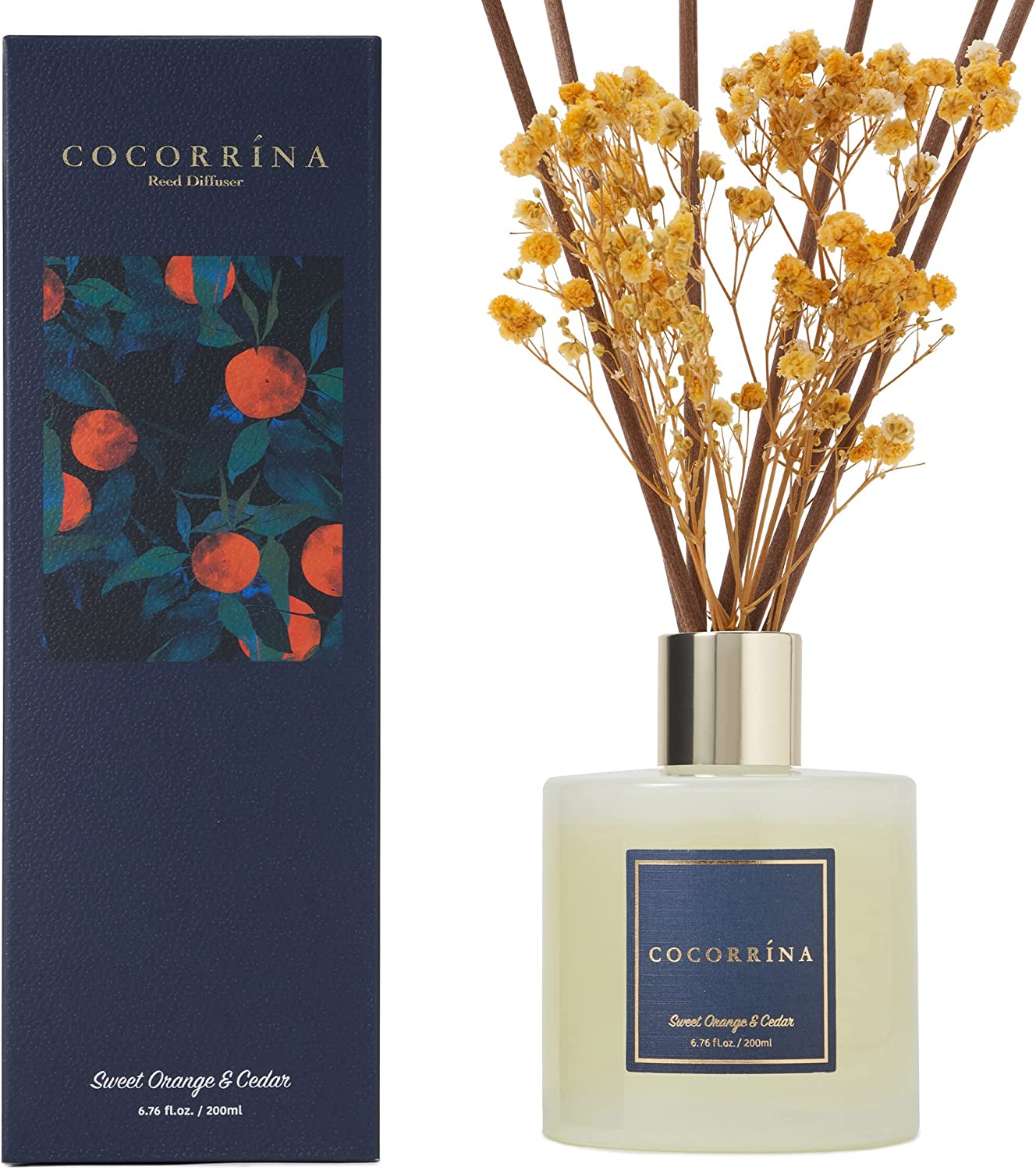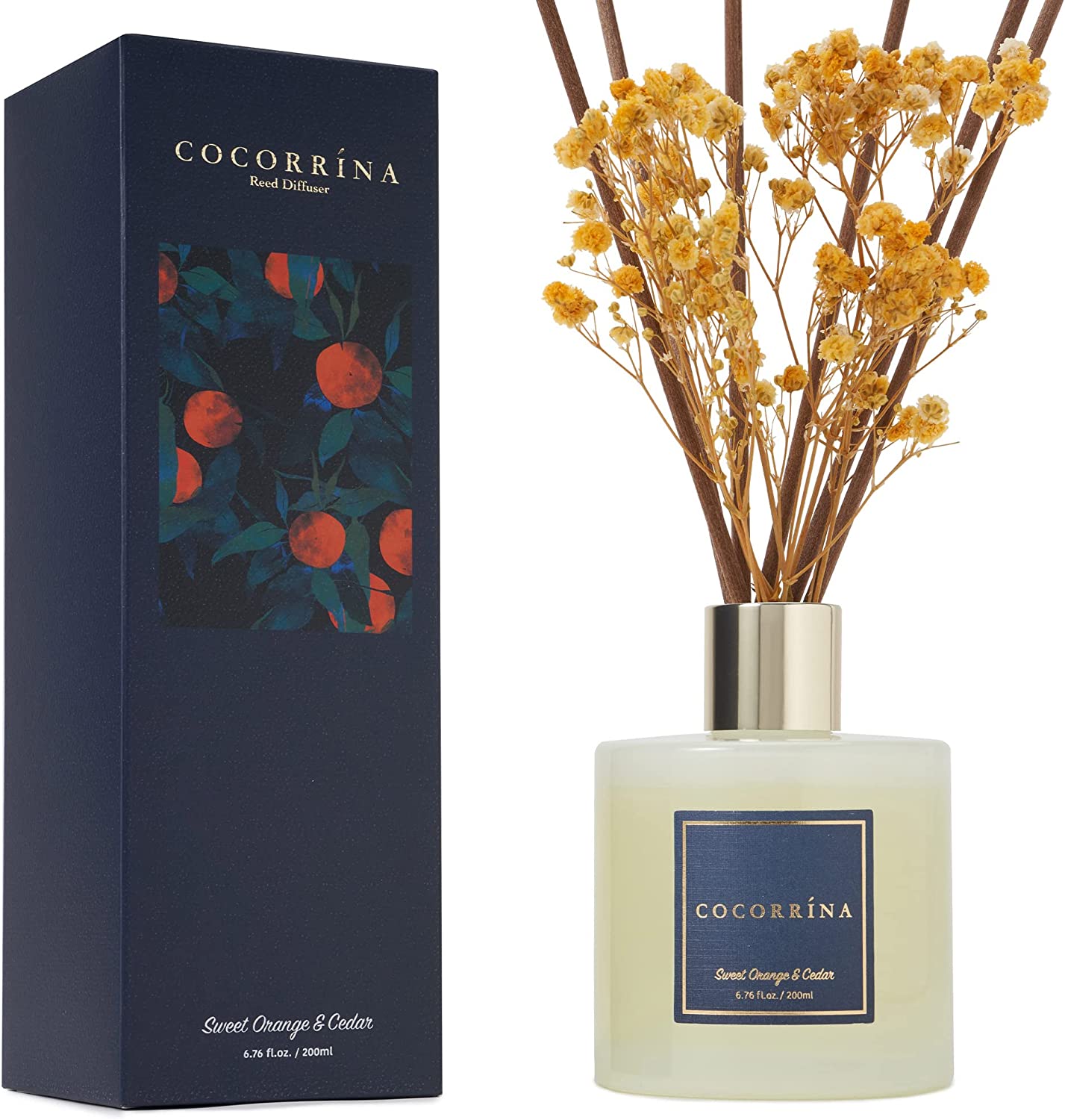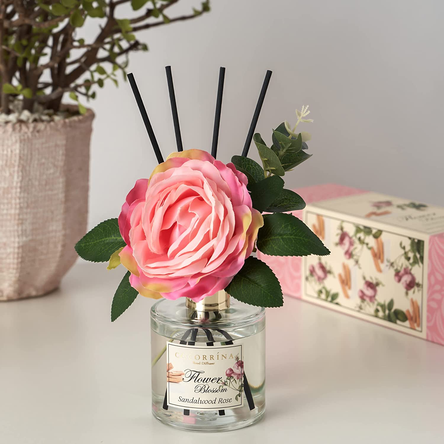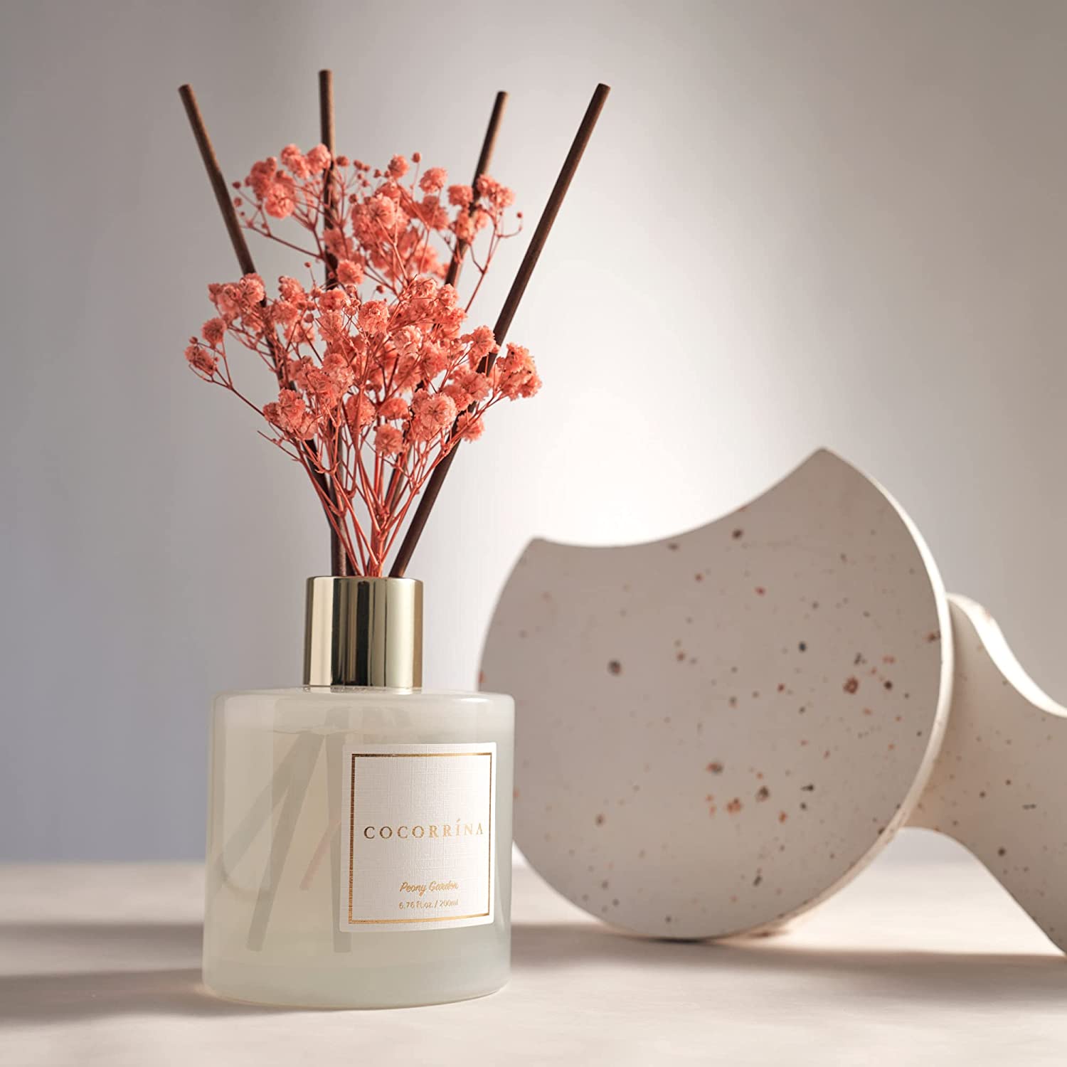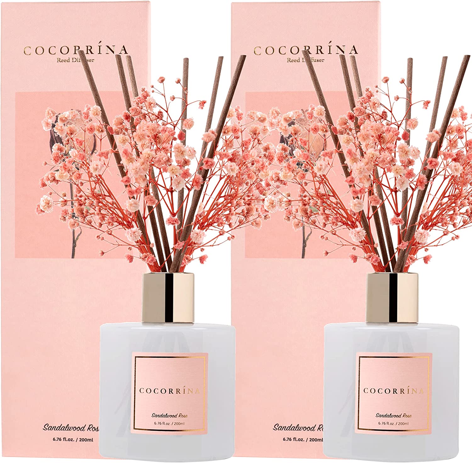 • Includes: One fragrance diffuser glass bottle, 6.7 fl oz mixture of essential oils combined with fragrance, one pc. of real preserved baby's breath flowers, and six pure cotton sticks. Adjust the amount of aroma released by adding or removing the sticks.
