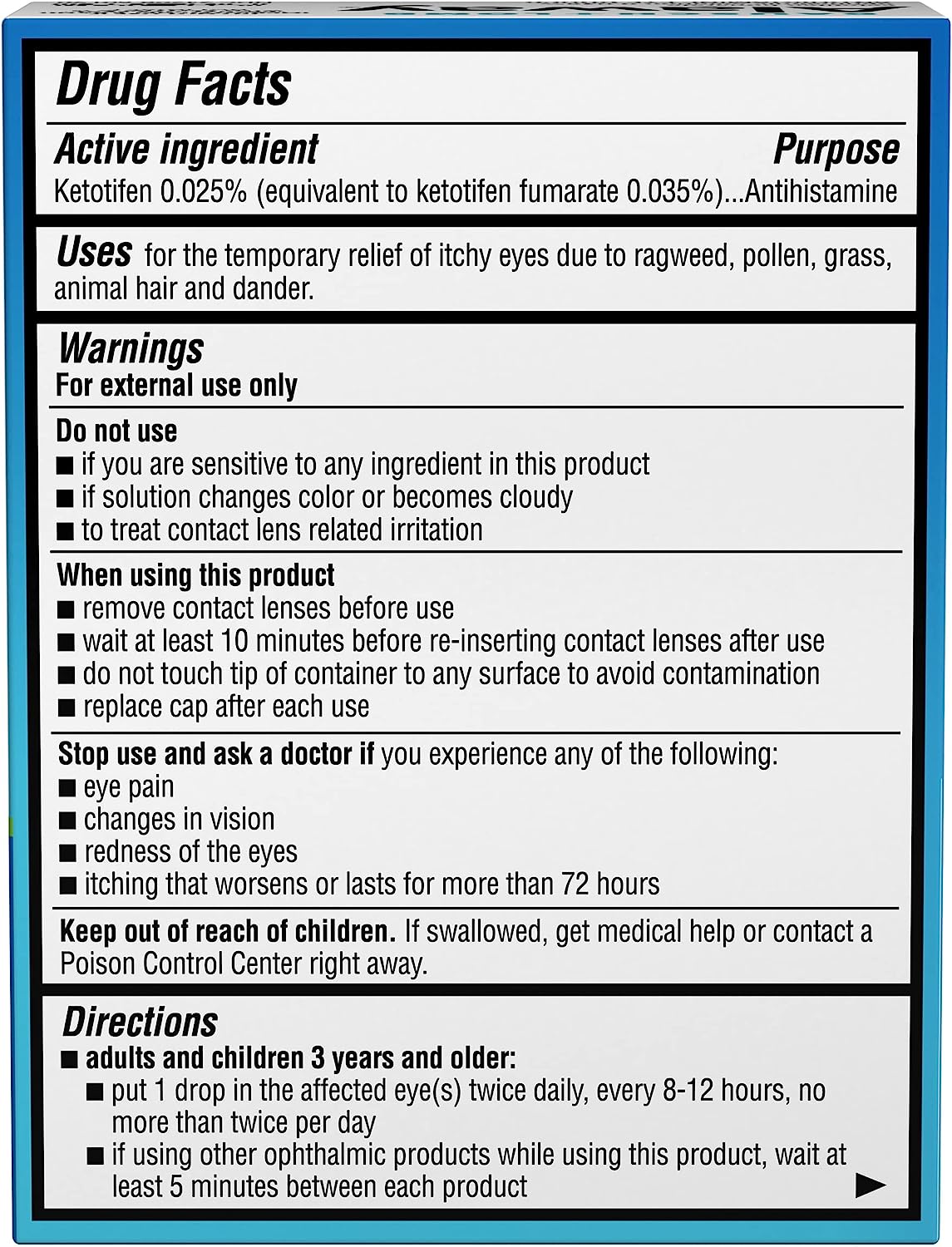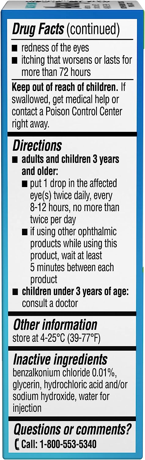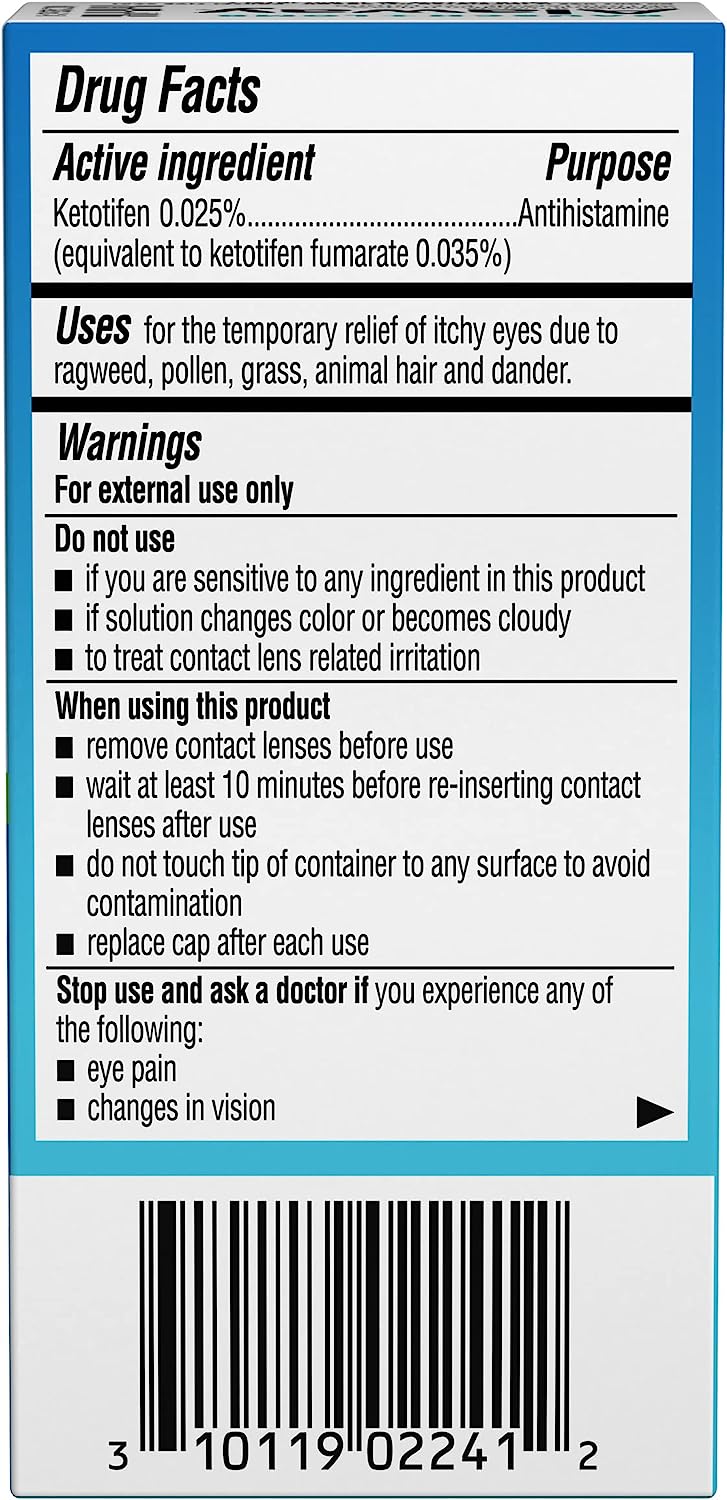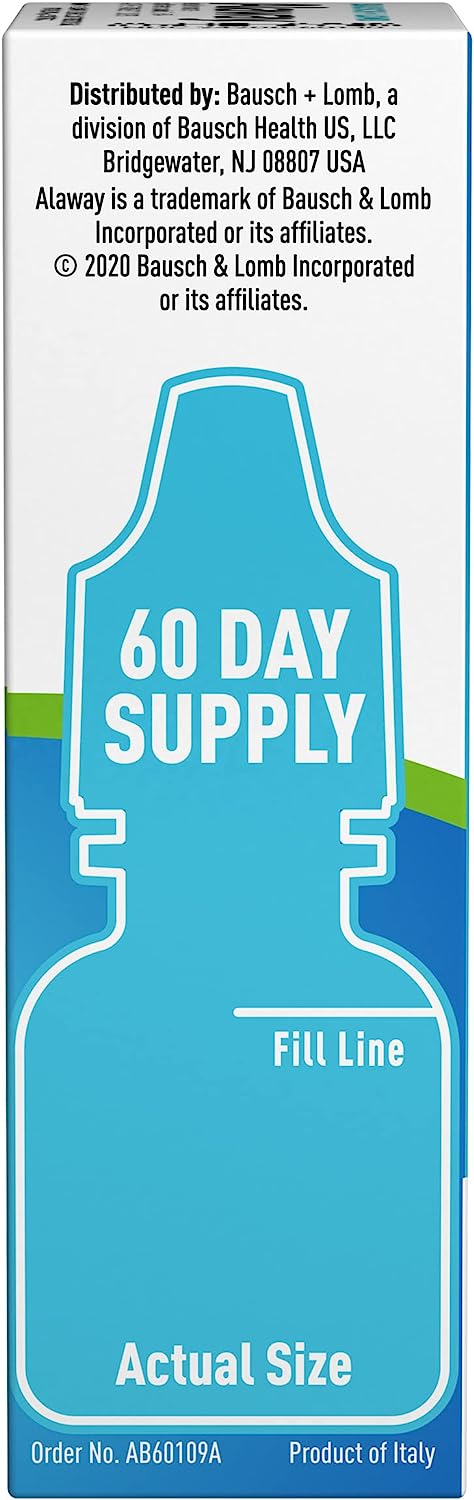 Itchy eyes? Don’t suffer waiting for your allergy pills to kick in. Get relief in minutes with Alaway antihistamine eye drops. From the eye care experts at Bausch + Lomb, Alaway eye drops provide original prescription-strength relief for up to 12 hours, with no prescription needed. With a single dose of these eye itch relief drops, you’ll get fast-acting, long-lasting relief from itchy eyes due to ragweed, pollen, grass, animal hair and dander. •Fast-acting eye itch drops for long-lasting relief •Original prescription strength antihistamine eye drops •Provides relief for up to 12 hours •For temporary relief of itchy eyes due to ragweed, pollen, grass, animal hair and dander •Ketotifen fumarate ophthalmic solution 0.035% •For adults and children ages 3 years and older •From the eye care experts at Bausch + Lomb