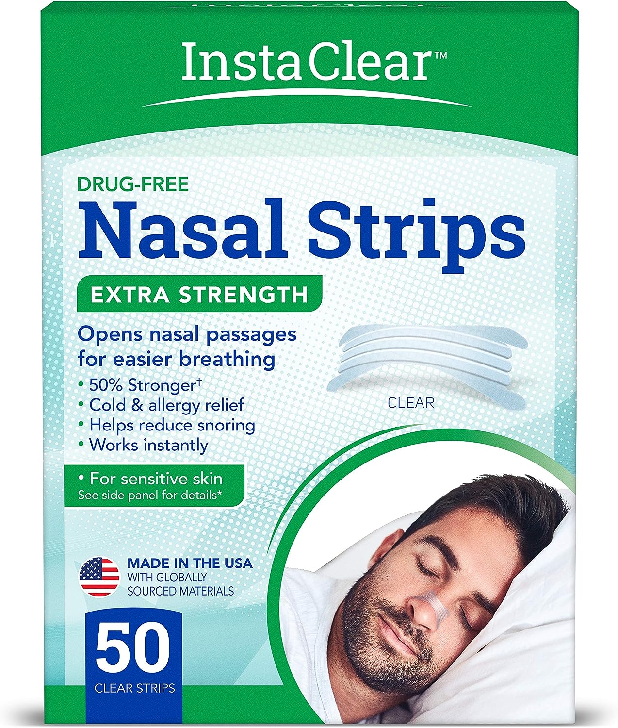 • Extra-strength nasal strips are 50% stronger than Instaclear non-extra-strength nasal strips