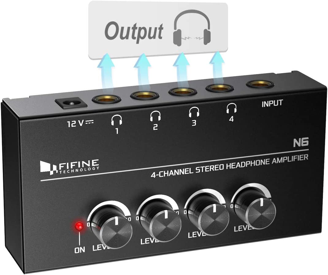 Fifine Headphone Amplifier 4 Channels Metal Stereo Audio Amplifier,Mini Earphone Splitter with Power Adapter-4x Quarter Inch Balanced TRS Headphones Output and TRS Audio Input for Sound Mixer-N6