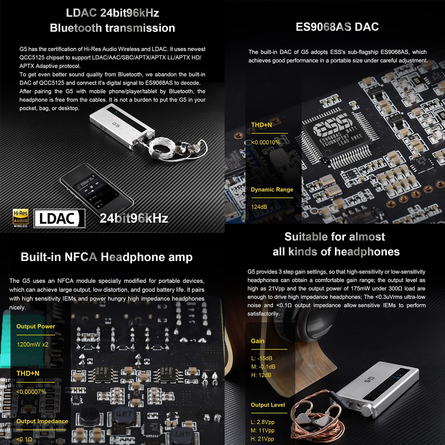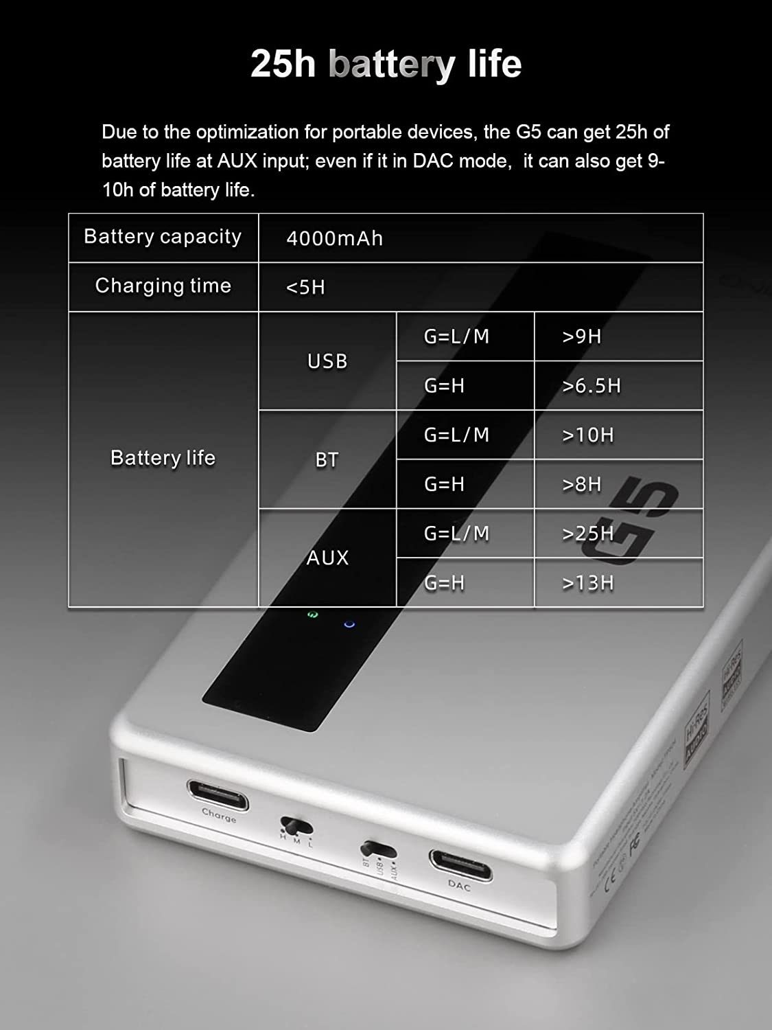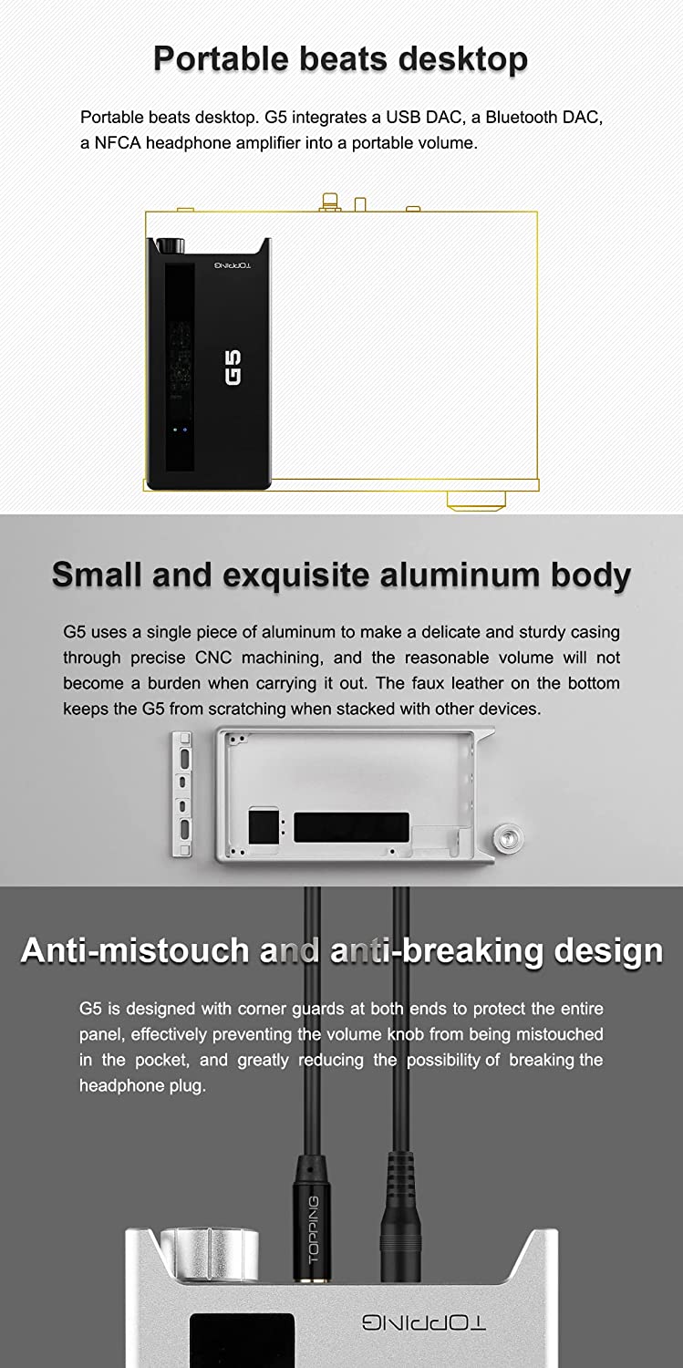 • 👍 Portable beats desktop ▶️Portable beats desktop. G5 integrates a USB DAC, a Bluetooth DAC, a NFCA headphone amplifier into a portable volume.