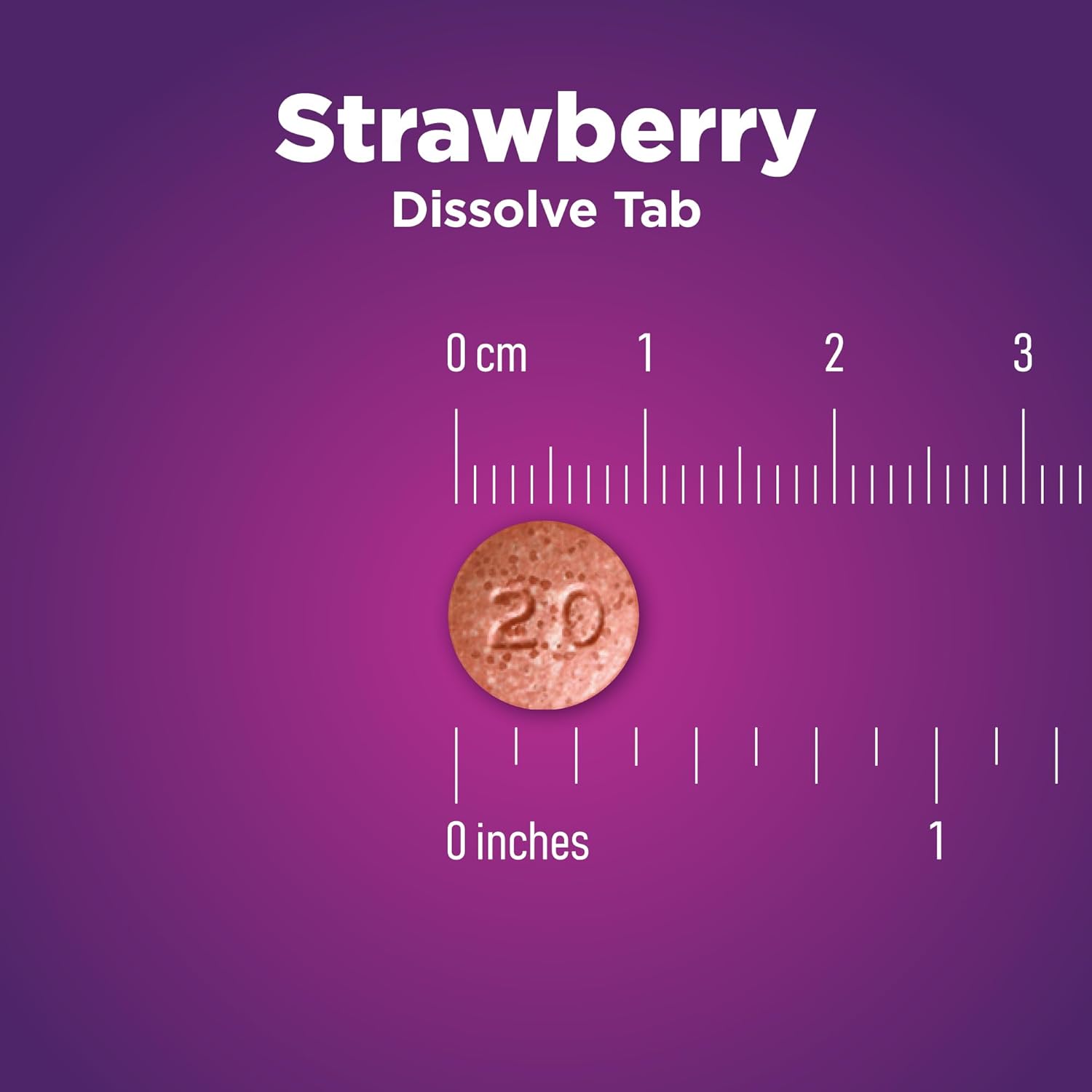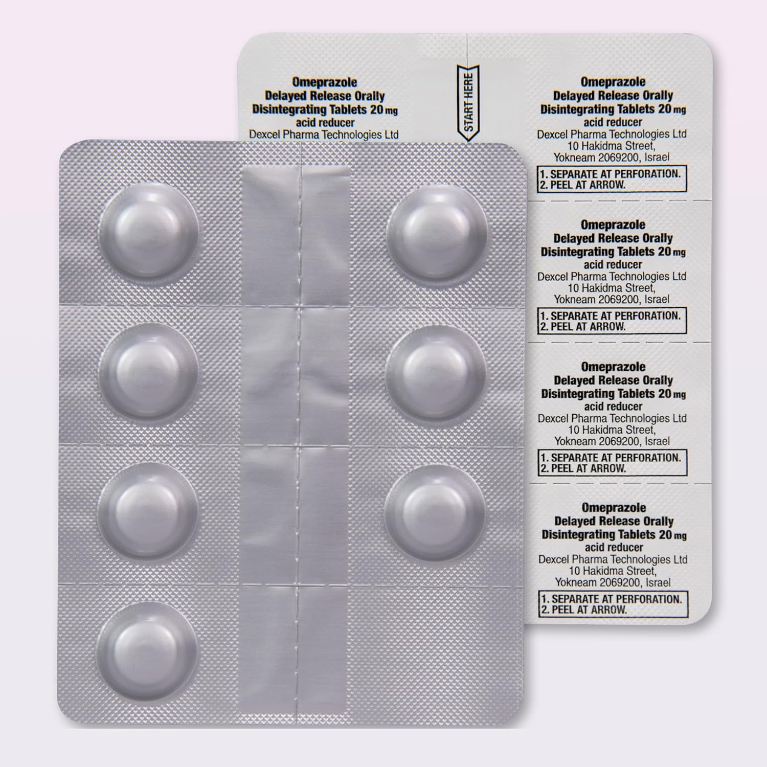 Compare to Prilosec OTC. Heartburn beware: Amazon Basic Care Omeprazole Orally Disintegrating Tablets, 20 mg, Strawberry Flavor, make it easy to treat frequent heartburn that occurs 2 or more days per week. The 24-HR tablets melt in your mouth and dissolve without water, so they are great to use when you are on the go. This acid reducer treats frequent heartburn that occurs 2 or more days per week. The active ingredient omeprazole 20 mg is a Proton Pump Inhibitor (PPI), which deactivates acid-producing pumps in the stomach lining to inhibit acid production at the source. This product is not intended for immediate relief of heartburn; may take 1 to 4 days for full effect.